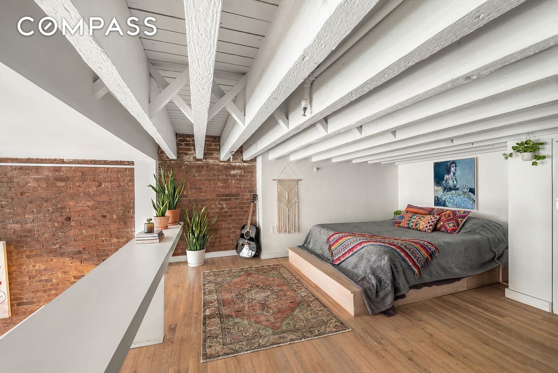 The upper-level bedroom loft includes exposed beams, custom built-ins, and a spacious closet.