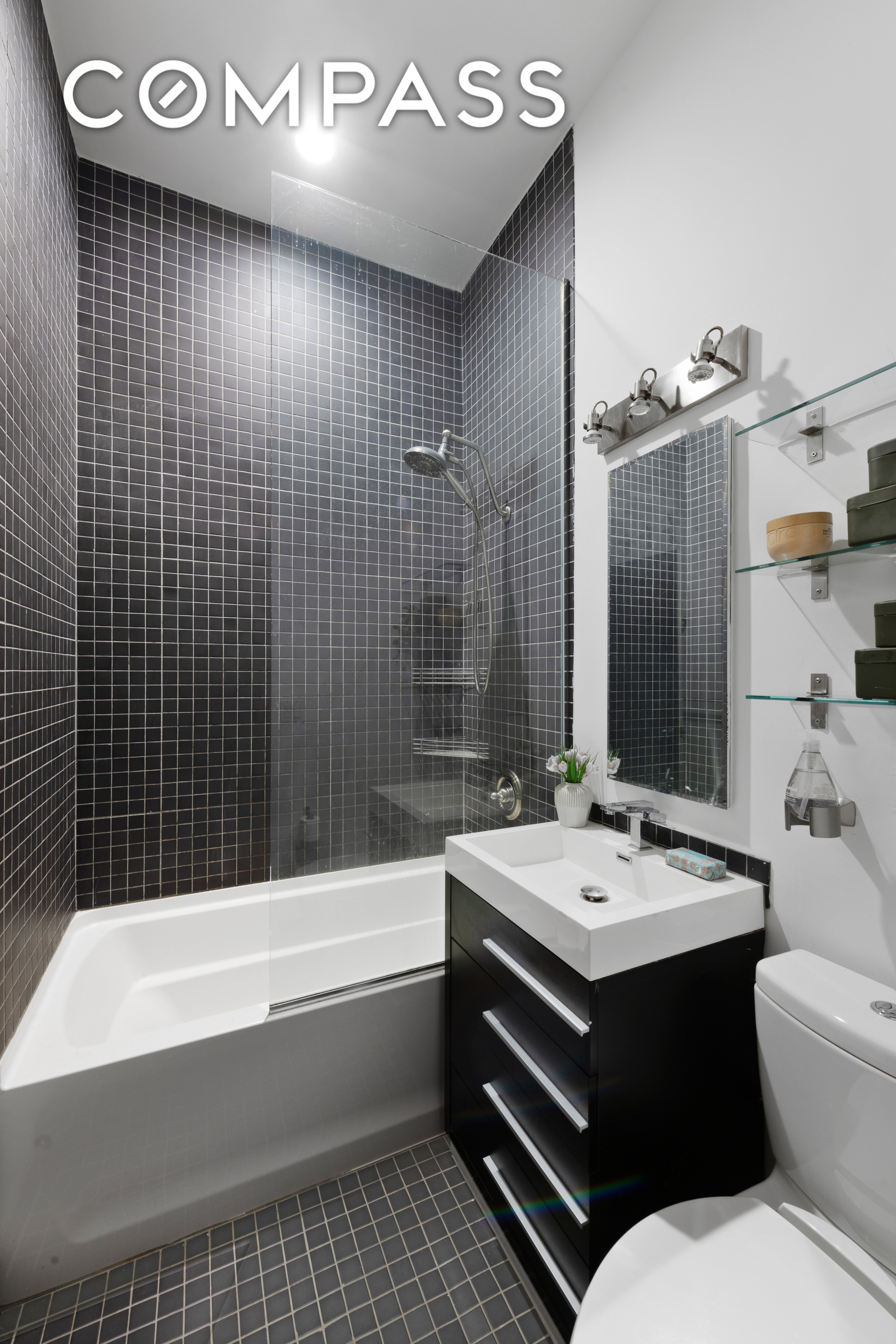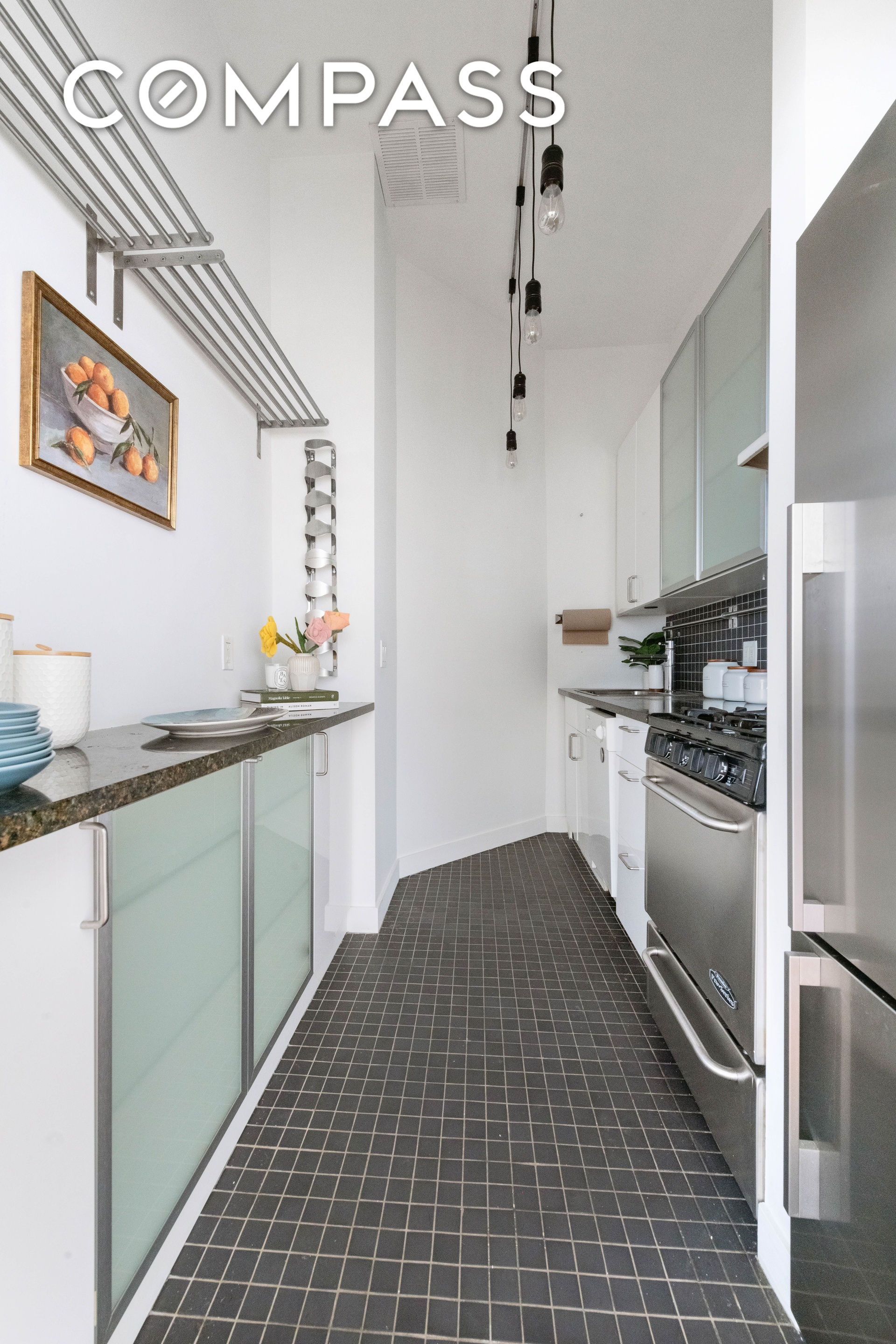Enjoy airy high ceilings, hardwood floors, and oversized windows and thru wall A/C units. The renovated bathroom features a soaking tub, and the kitchen boasts a pullman layout with granite countertop.
