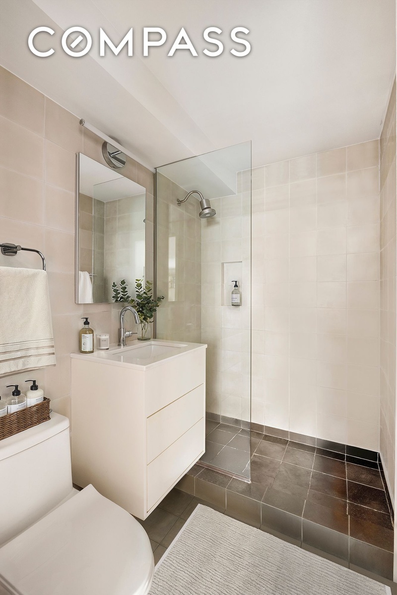 North and east exposures illuminate the residence throughout the day, and the windowed pass-through kitchen is appointed with sleek countertops and premium appliances. The renovated bathroom reflects understated modern elegance.