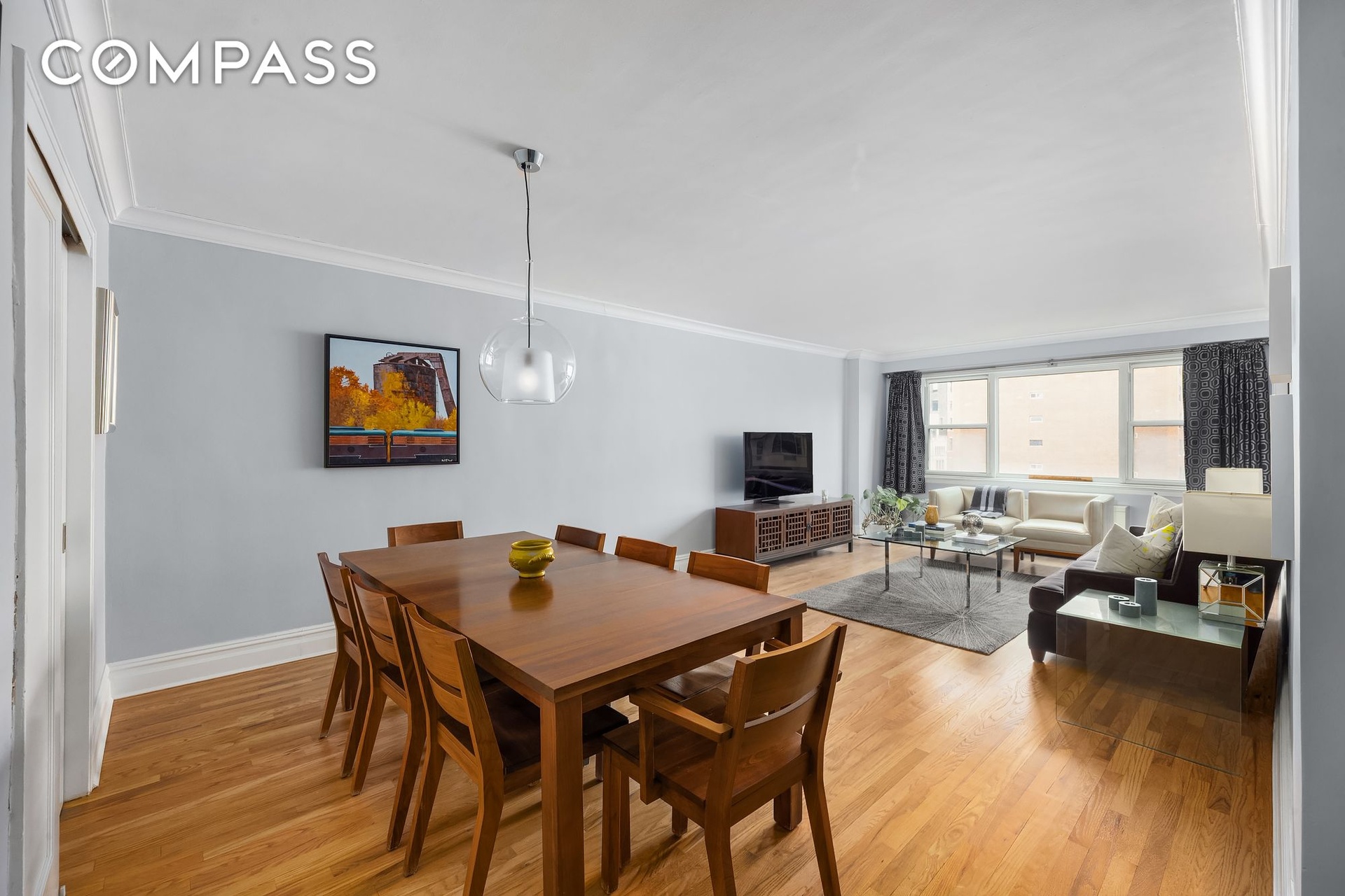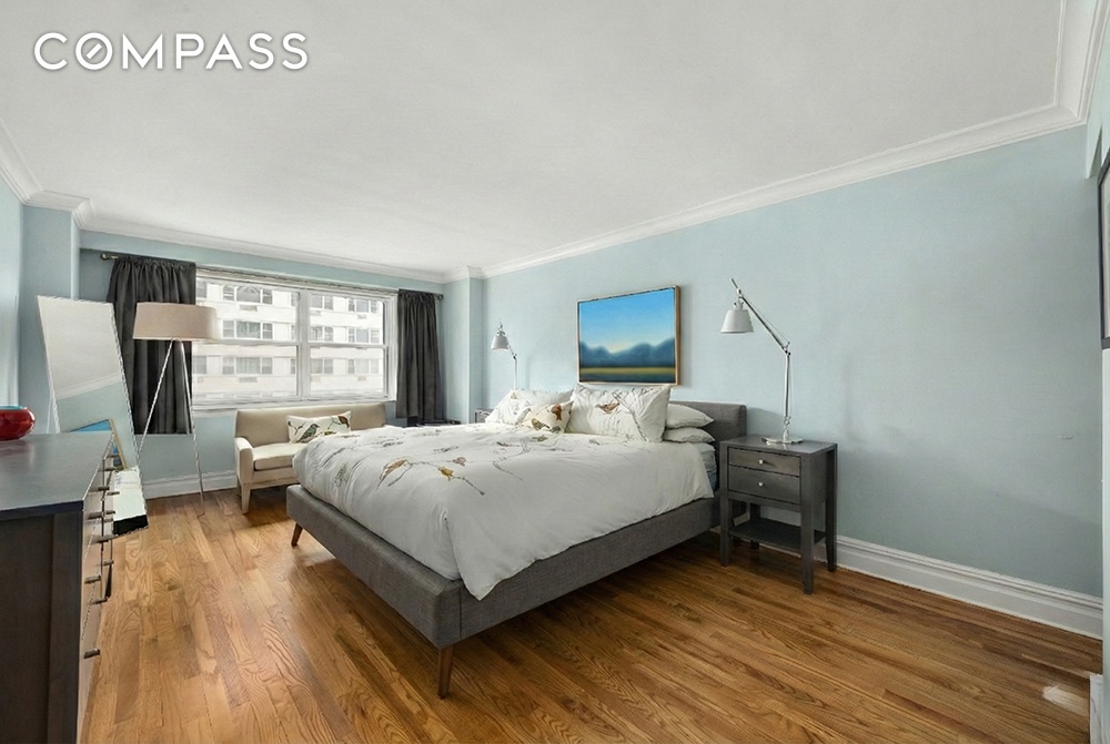 An entry foyer and adjacent coat closet provides a warm entry leading into a sun-filled, east-facing living room with open views over Sixth Avenue. A full wall of windows brings excellent morning light, while the generously scaled layout easily accommodates oversized living and dining furniture, ideal for both everyday comfort and entertaining.