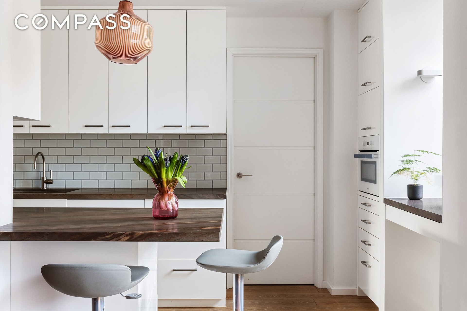 A gracious entry gallery with Ashfield schist flooring and custom oak veneer sets the tone for the meticulous craftsmanship throughout. The expansive south-facing living room and adjacent library (or fourth bedroom) are filled with natural light and offer views of downtown Manhattan and the Freedom Tower. A custom bar with quartzite counters and a private balcony with new tiling and drainage create an ideal setting for entertaining and seamless indoor-outdoor living.