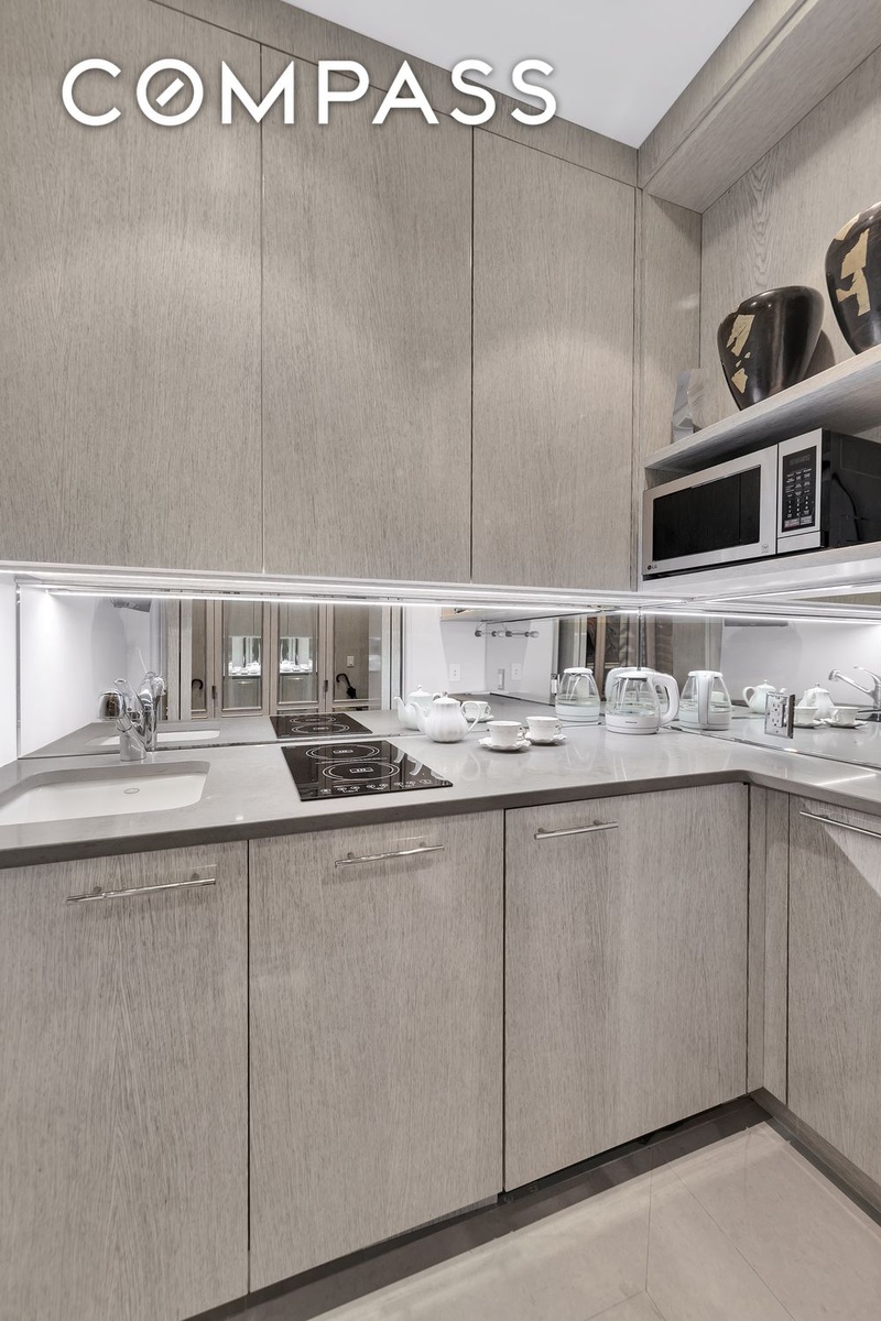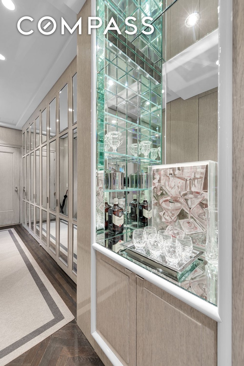An entry gallery features custom mirrored cabinetry and refined wall finishes that enhance light and create a strong sense of arrival. Just off the entry, a discreet kitchenette sits behind sliding, folding doors and is thoughtfully designed for convenience. It is equipped with an under-counter refrigerator, a compact dishwasher, and a two-burner induction cooktop, supporting light meals and entertaining. The living room is polished and inviting, with north-facing windows, a decorative fireplace, and herringbone hardwood floors. Subtle ceiling details reinforce the apartment’s prewar proportions, while a built-in bar and a powder room, uncommon for F-line residences in the Ritz Tower, make the home especially well suited for entertaining.
