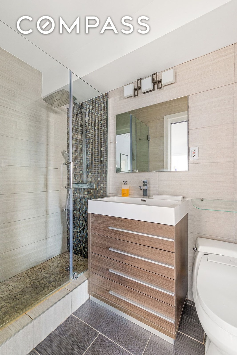 A private hallway off the living room leads to the second bedroom, ideal as a nursery, home office, or den, along with a recently renovated full bathroom featuring high-end Kohler fixtures and contemporary finishes. At the end of the hallway, the oversized king-sized primary suite offers a true retreat, complete with a spa-like en-suite bathroom featuring Hansgrohe fixtures and a luxurious rainfall shower, newly built custom walk-in closets, and a rare additional en-suite office.