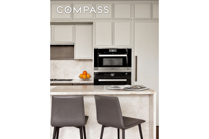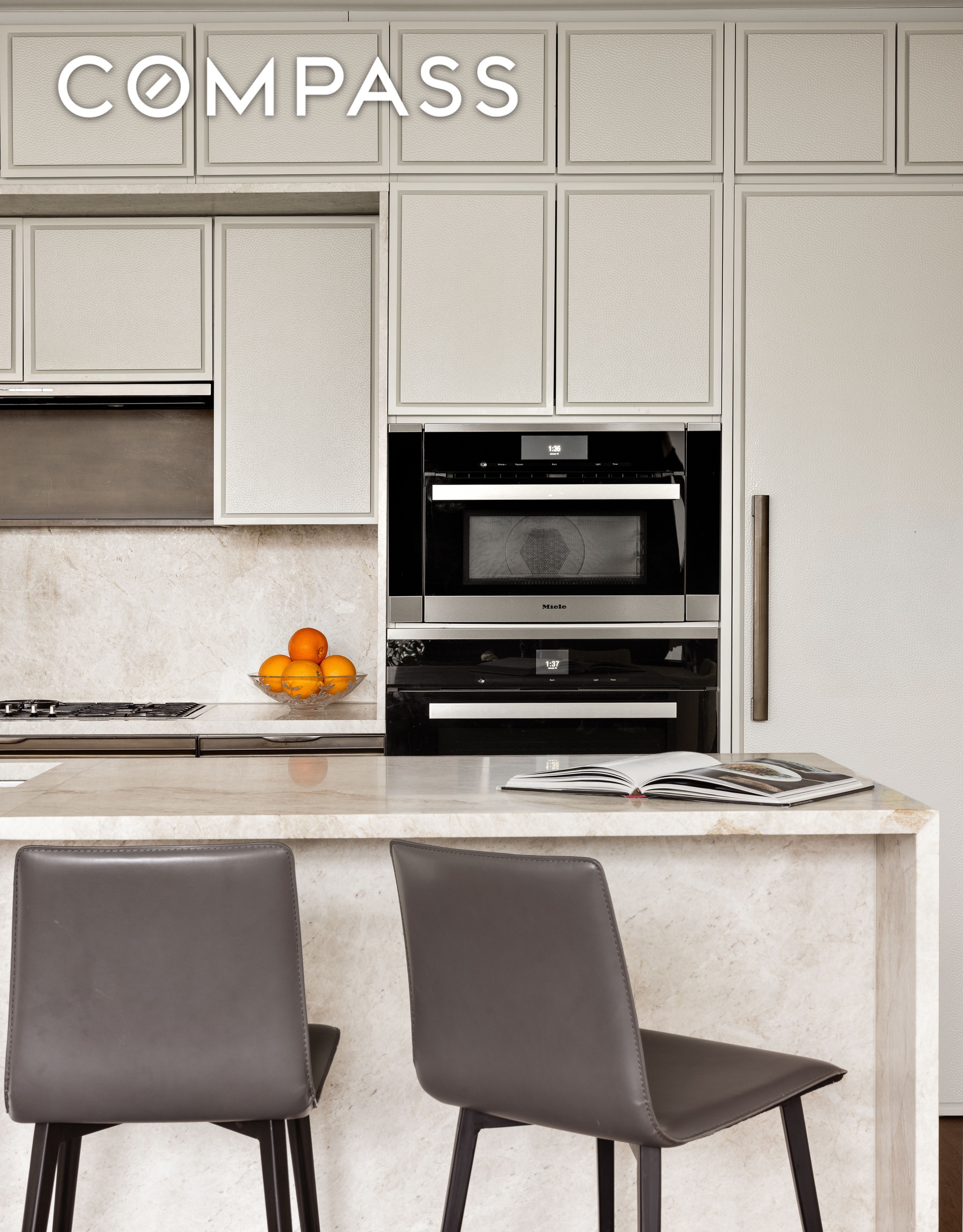 The chef’s kitchen is thoughtfully appointed with Miele appliances, an eat-in island, and abundant custom cabinetry. The primary bedroom is a true retreat, complete with a custom closet and a spa-like en-suite bath featuring a dual-sink vanity, deep soaking tub, and glass-enclosed shower. A generous second bedroom, a stylish powder room, and an in-unit washer and dryer complete this impeccably designed home.