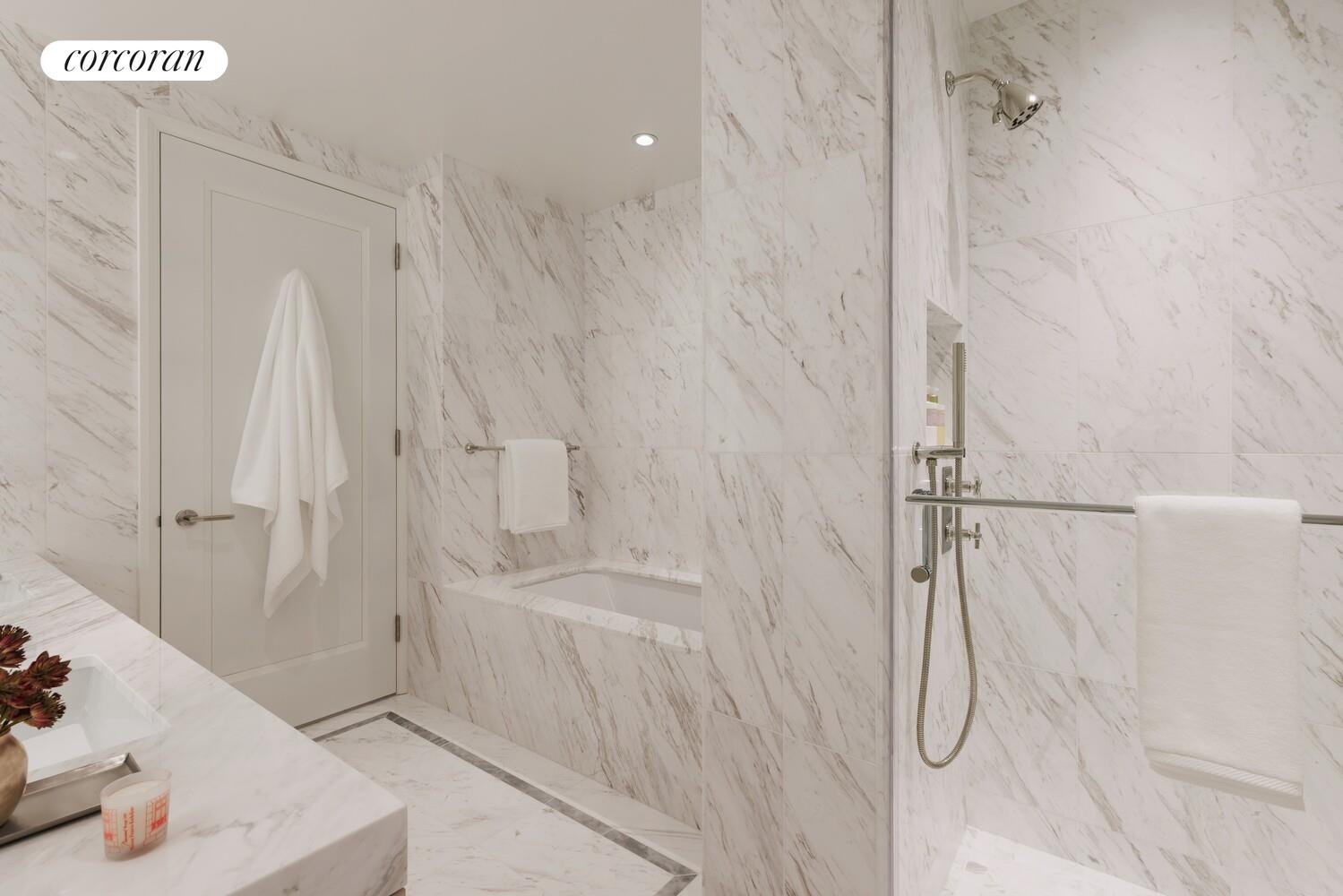 Residence 35A is an exquisite corner two-bedroom, two-bath home spanning 1,331 SF with bright southwest exposure overlooking the NYC skyline with peaks of Central Park and East River views. This stunning residence features 7-inch-wide chevron patterned European French oak floors and elegant bay windows that frame the open views. The foyer includes an entry closet and leads to a grand living area with open kitchen and island for additional seating and entertainment. The oversized kitchen also includes a double wide pantry and is outfitted with Miele appliances including a wine fridge. Custom Italian cabinetry paired with Imperial Danby marble countertops accented by polished nickel fixtures, and stainless-steel sink with garbage disposal complete the space. The primary bedroom suite features an oversized walk-in closet and 5-fixture ensuite bathroom with a custom vanity topped with Volaka marble countertops and undermounted sinks, accented by polished nickel fixtures. Greek Volaka marble flooring with a Grigio Niccola border completes the elegant design. The secondary bedroom is equipped with two closets, and the secondary bathroom includes a custom vanity with Turkish Bianco Dolomite marble countertop, walls and flooring. Residence 35A comes with smart thermostats and vented washer and dryer.