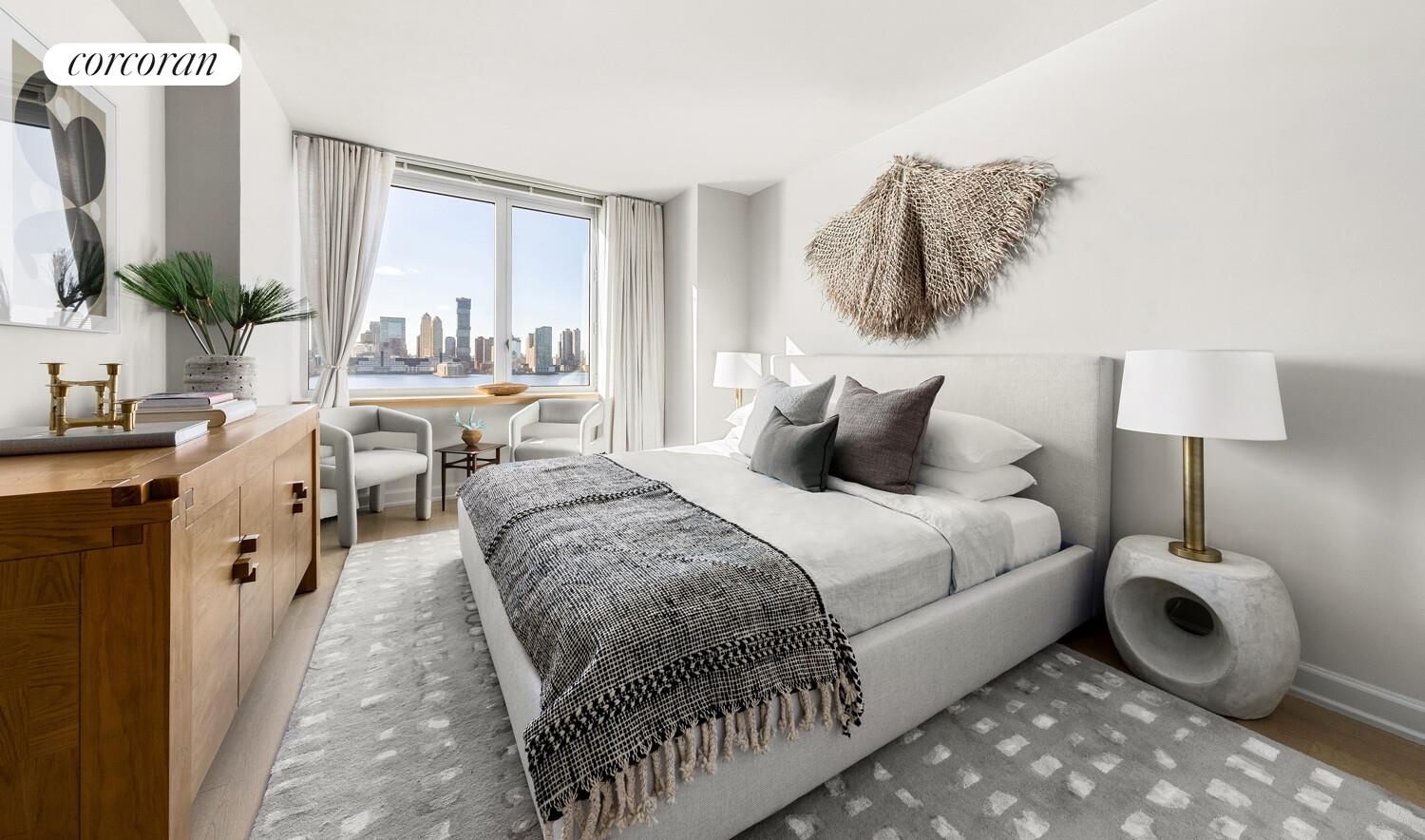 Enjoy Hudson River views and breathtaking sunsets in this sundrenched, spacious 718 sq. ft. west-facing one-bedroom residence designed by Pelli Clarke Pelli to meet the highest level of green building certification. This bright, river-view residence boasts ample closet space in the bedroom and by the foyer. The open kitchen features a suite of stainless steel, Energy Star appliances and a granite breakfast bar that is perfect for entertaining. A Bosch washer and dryer set completes the appliance package and a four-pipe multi-zone heating and cooling system allows for whisper quiet comfort and energy savings year-round.