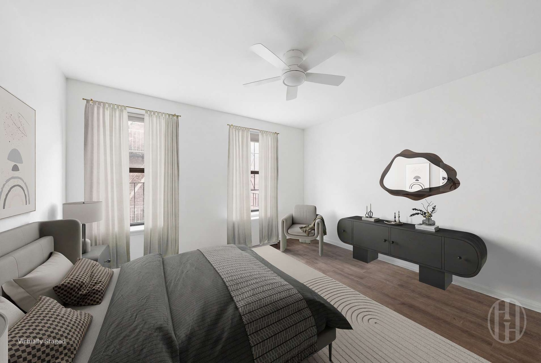 The rare windowed eat-in kitchen features stainless steel appliances, a dishwasher, a brand-new stove, generous cabinet and counter space, and a custom pantry. Grey wood flooring runs through the living area, which is scaled to accommodate a separate dining zone or home office. The bedroom fits a full suite comfortably, with deep closet storage to match. The building has just completed and fully funded major capital improvements, including new heat pumps, boilers, electrical upgrades, and facade restoration.