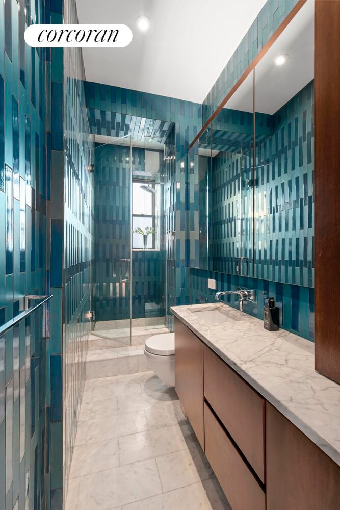 The windowed bathroom is a true retreat. Handmade Heath ceramic tiles in a signature blue line the walls, while marble floors with radiant heat, a glass-enclosed rain shower, Grohe fixtures, and a custom mirrored cabinet with built-in storage and laundry hamper complete this beautifully appointed space.