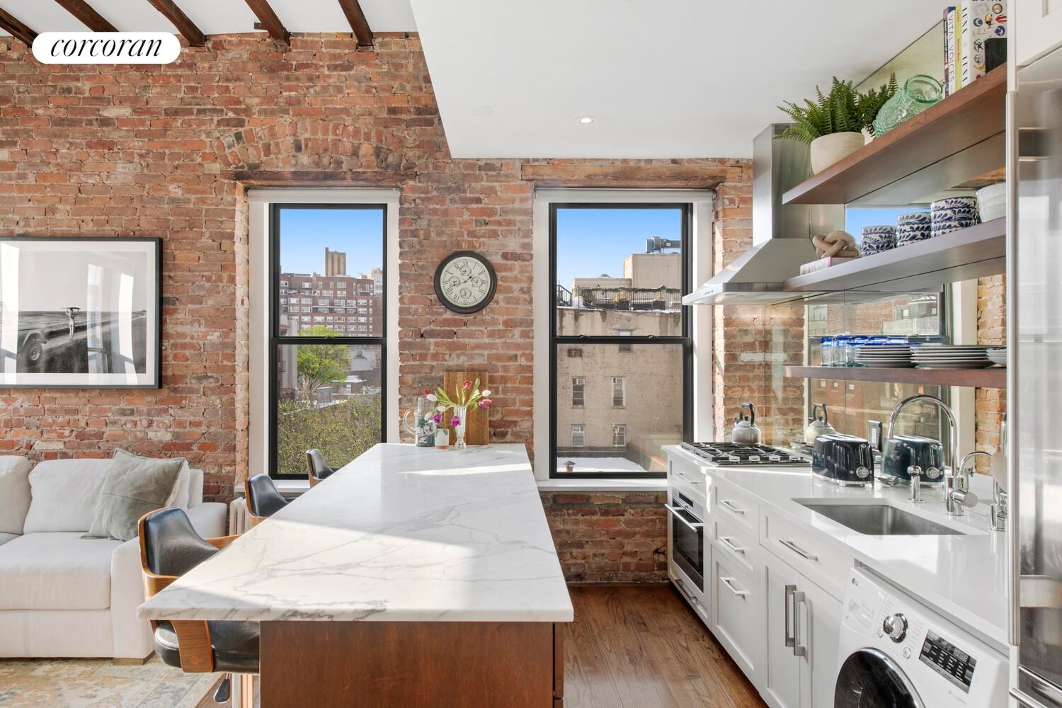 From the moment you enter, the apartment's character is undeniable. Gorgeous, exposed wood beams crown the soaring 11-foot ceilings, creating a dramatic yet intimate atmosphere that sets the tone for a home that feels both timeless and deeply personal. Warm hardwood floors and exposed brick complete the picture, while seven oversized Pella sound-proof windows flood the space with natural light from southern and western exposures. Brand new wireless electric remote-controlled roller shades and a sound-proofed common wall ensure the kind of peace and quiet that's nearly impossible to find in Manhattan.