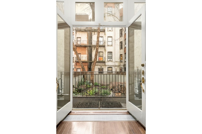 The parlor level immediately sets an impressive tone with ceilings reaching nearly 13 feet and a dramatic glass wall with double doors opening directly to the garden, creating a bright, south-facing entertaining space. This floor features a gracious living area centered around one of two wood-burning fireplaces and currently arranged in an open layout that also accommodates dining. The dining space connects seamlessly to a large eat-in kitchen with a built-in banquette positioned beside a wall of windows overlooking leafy East 91st Street. The kitchen is outfitted with custom cherry wood cabinetry, generous storage, and a full suite of stainless steel appliances. A full bathroom and two walk-in closets complete this level.