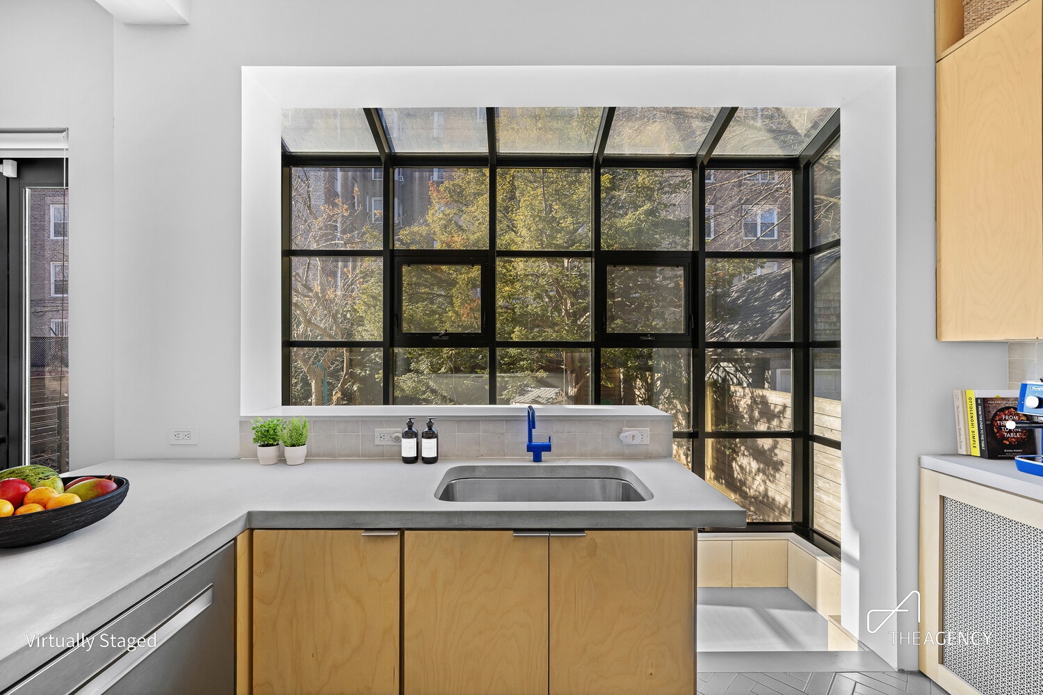 The kitchen is defined by a dramatic floor-to-ceiling window wall, creating a seamless connection between indoors and out. Sunlight moves across the space throughout the day, elevating everyday moments such as morning coffee, preparing meals, or hosting friends into something quietly special. Thoughtfully designed with custom finishes and high-end appliances, including a Wolf six-burner stove, Fisher & Paykel refrigerator, and Bosch dishwasher, this is a kitchen meant to be experienced as much as admired. The kitchen, hallway, first-floor bathroom, and backyard were comprehensively renovated in 2022.