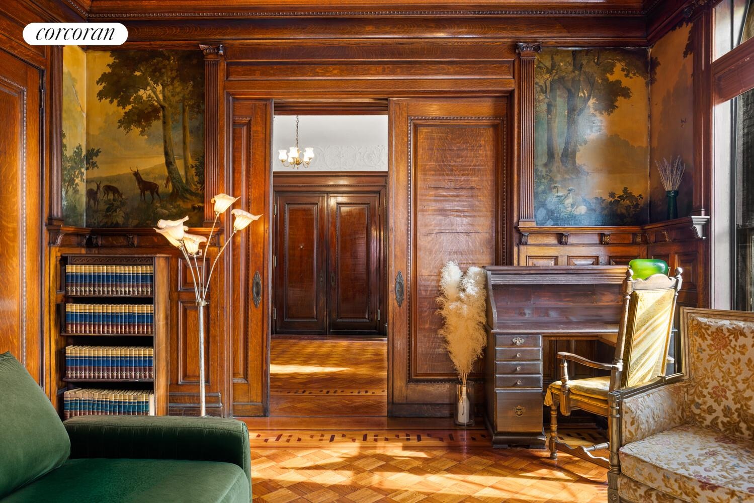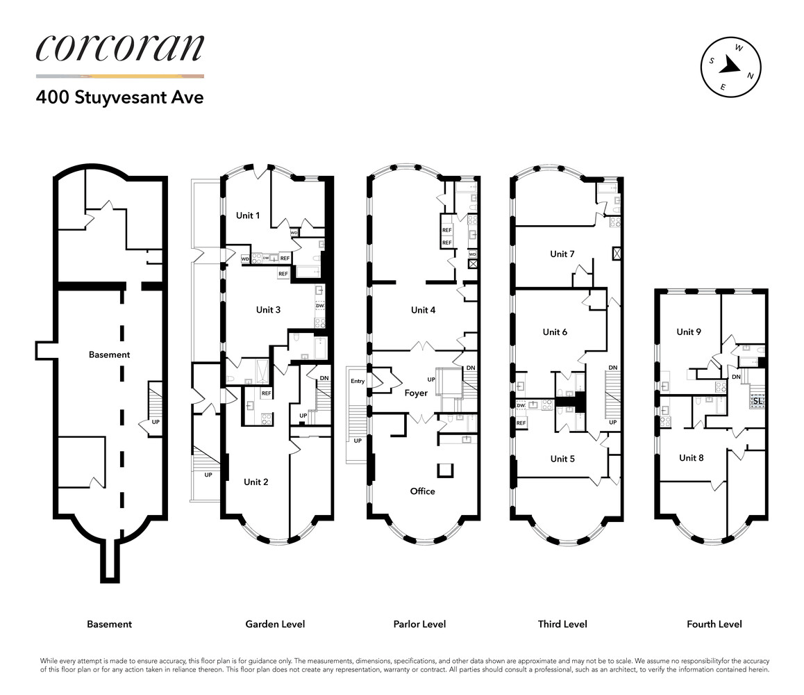 Boasting 5,342 square feet and currently configured as a grand 9-unit home, the 22X75 building sits on a 22X95 corner lot on Stuyvesant Ave and Bainbridge St, both of which are historic and landmarked blocks. The entrance is cleverly tucked on Bainbridge St, allowing for massive units that all receive a great deal of sunlight. The building retains 8 tenants. The crown jewel parlor unit and office are available for owner occupancy or rental, rich in period details including floor-to-ceiling dark wood, coffered ceilings, wainscoting, pier glass mirror, Corinthian columns, pocket doors, parquet flooring, plaster moldings, and more.