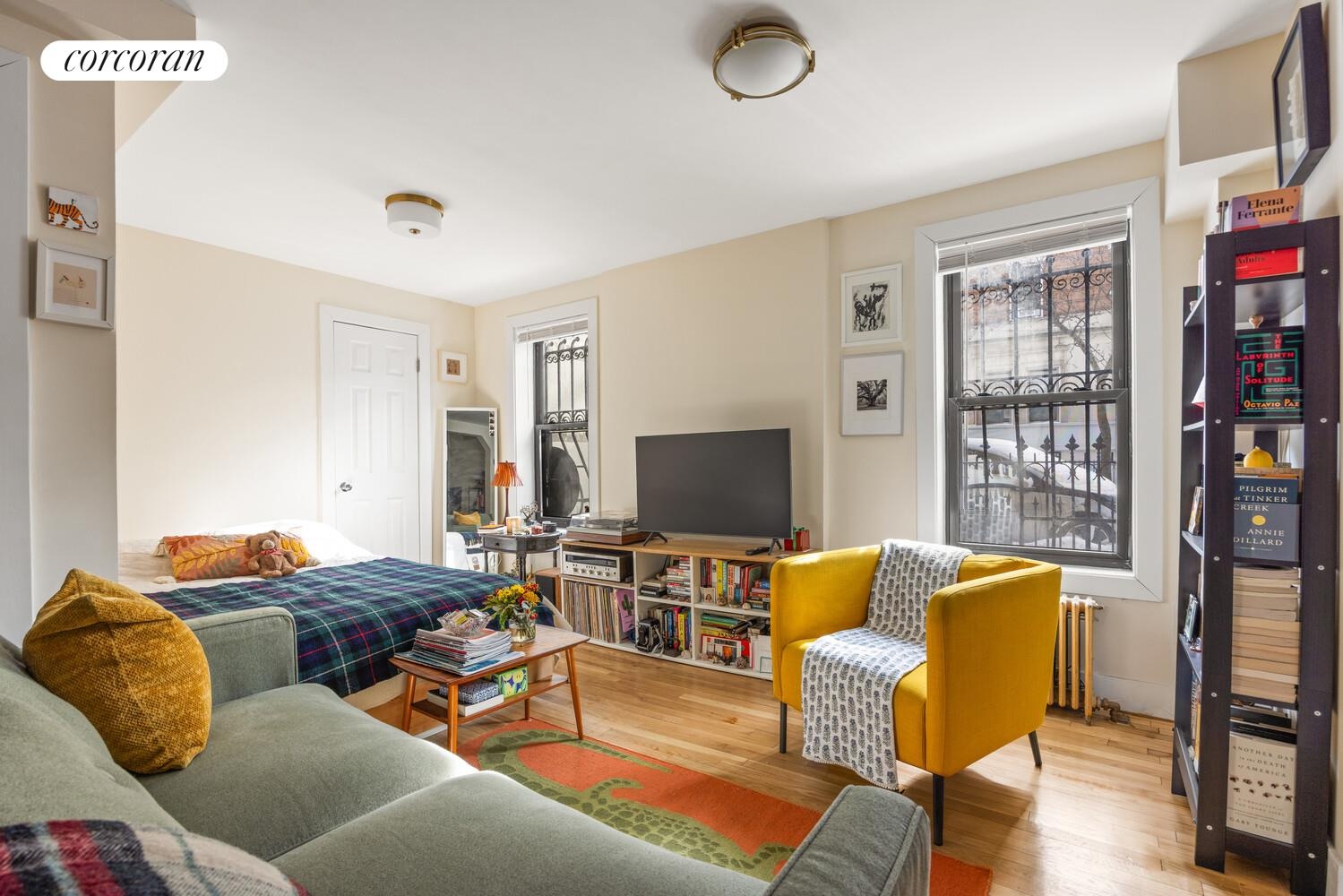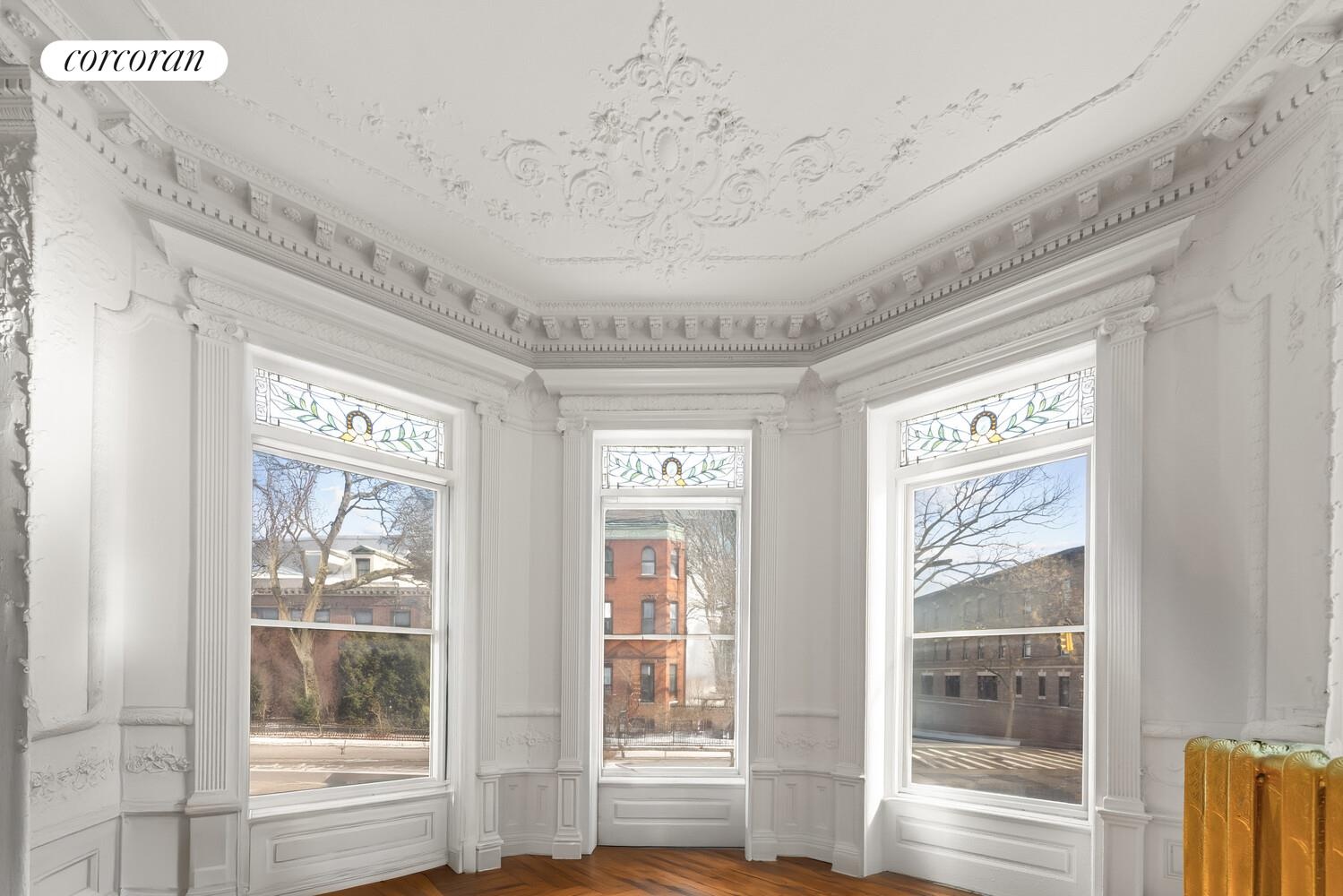 Inside, the building's original architectural bones remain a constant source of delight: soaring ceiling heights, original hardwood floors, detailed plaster medallions, and deep-set bay windows that flood each space with warm afternoon light. Period millwork and ornamental fireplace surrounds speak to the artistry of the craftsmen who built this home at a time when Stuyvesant Heights was emerging as one of Brooklyn's most prestigious residential neighborhoods.