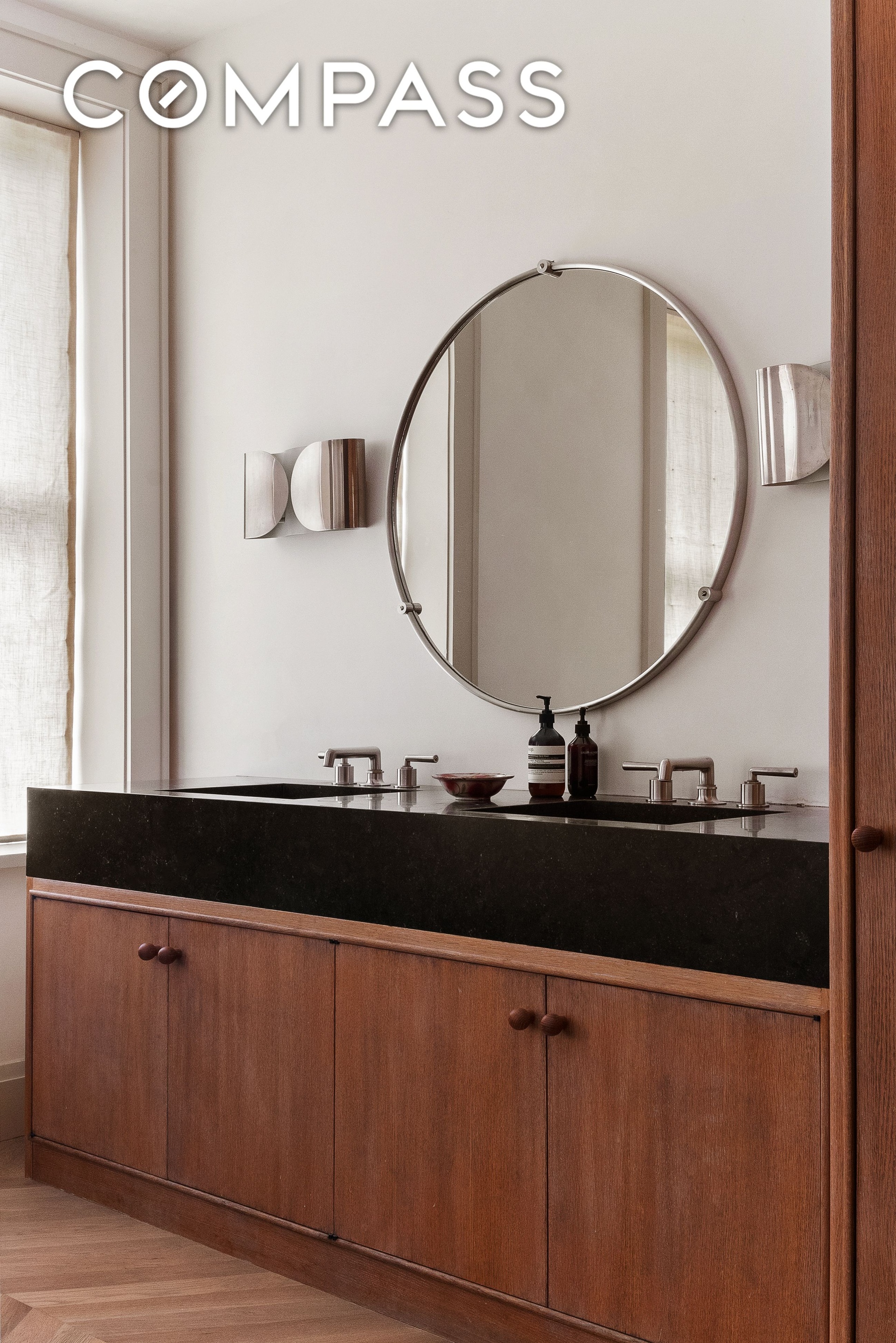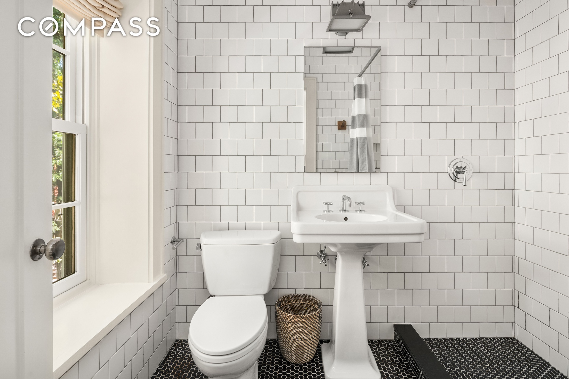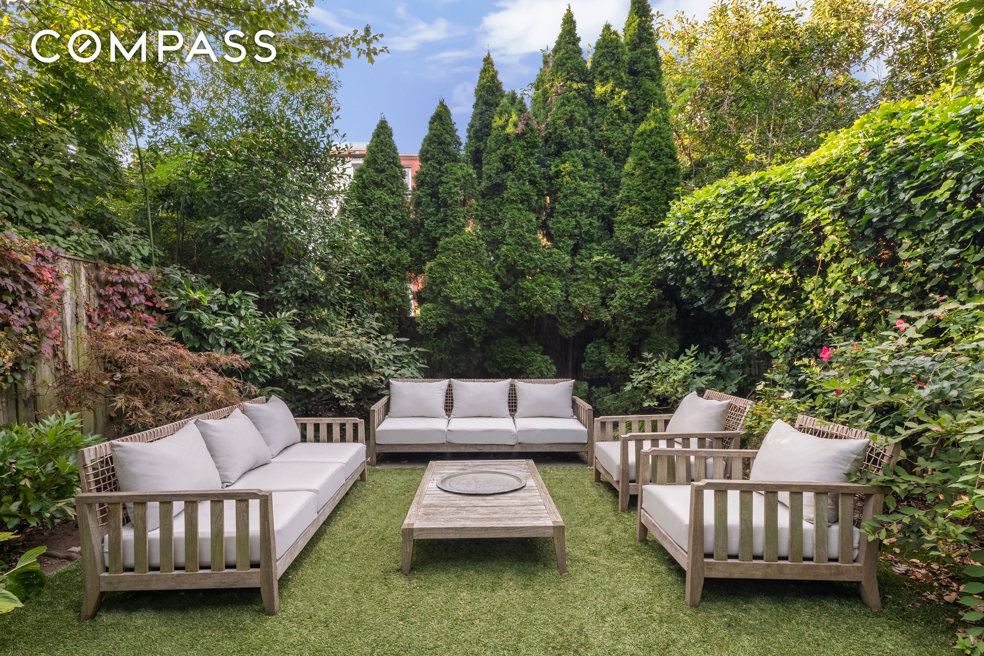 The setback and wide stoop entrance lead to the parlor floor, which serves as the main living and entertaining space, with a beautifully proportioned living room, an elegant curved staircase, and an open kitchen with a marble counter and backsplash, stainless steel appliances, a center island, and a dining area with a built-in banquette. Access the back terrace through two large custom glass doors that overlook the incredible park-like garden with lush, mature landscaping for ultimate privacy.