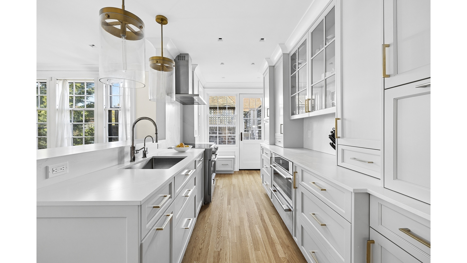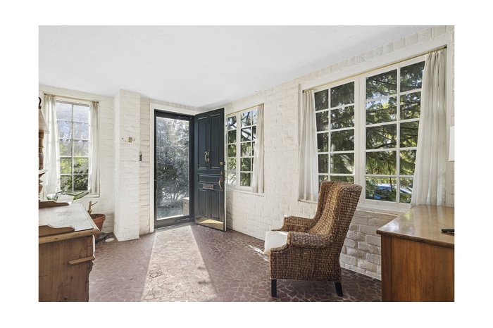 A charming entry sunroom with terracotta clay tiles welcomes you into the home, setting a warm and inviting tone. The gracious living room, anchored by a built-in gas fireplace, offers a refined space for both intimate evenings and lively entertaining, complemented by a tastefully appointed powder room discreetly located for guests. The newly renovated open kitchen is a chef's dream, featuring custom cabinetry, a custom walnut built-in dining room sideboard with bespoke hardware, Silestone countertops, and premium stainless steel appliances, including a Sub-Zero refrigerator, Bosch dishwasher, Waterstone faucet, and Fulgor Milano oven with warming drawer. A door just off the kitchen opens to an expansive deck above the garage, providing an elegant setting for al fresco dining, morning coffee, or relaxed outdoor entertaining.