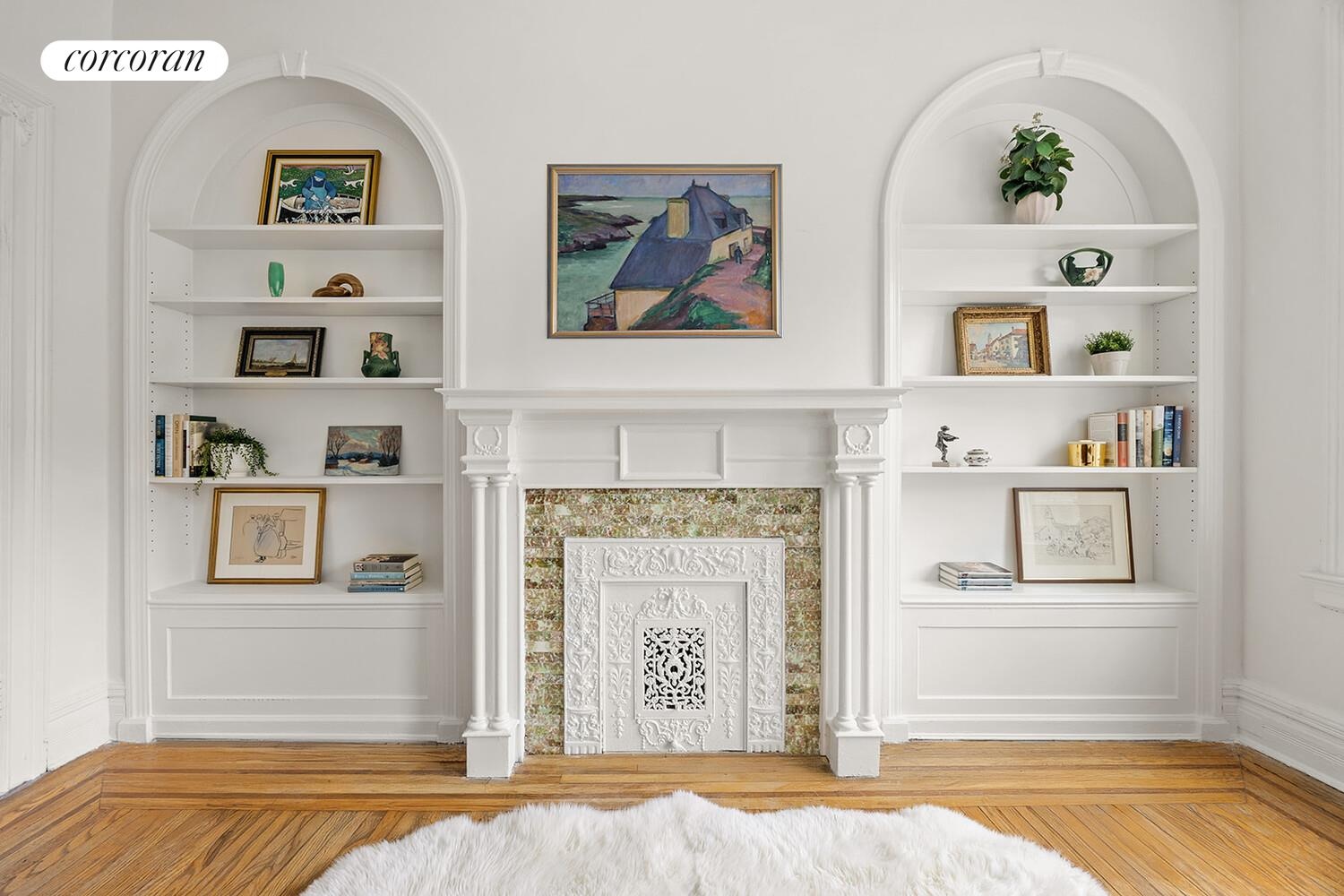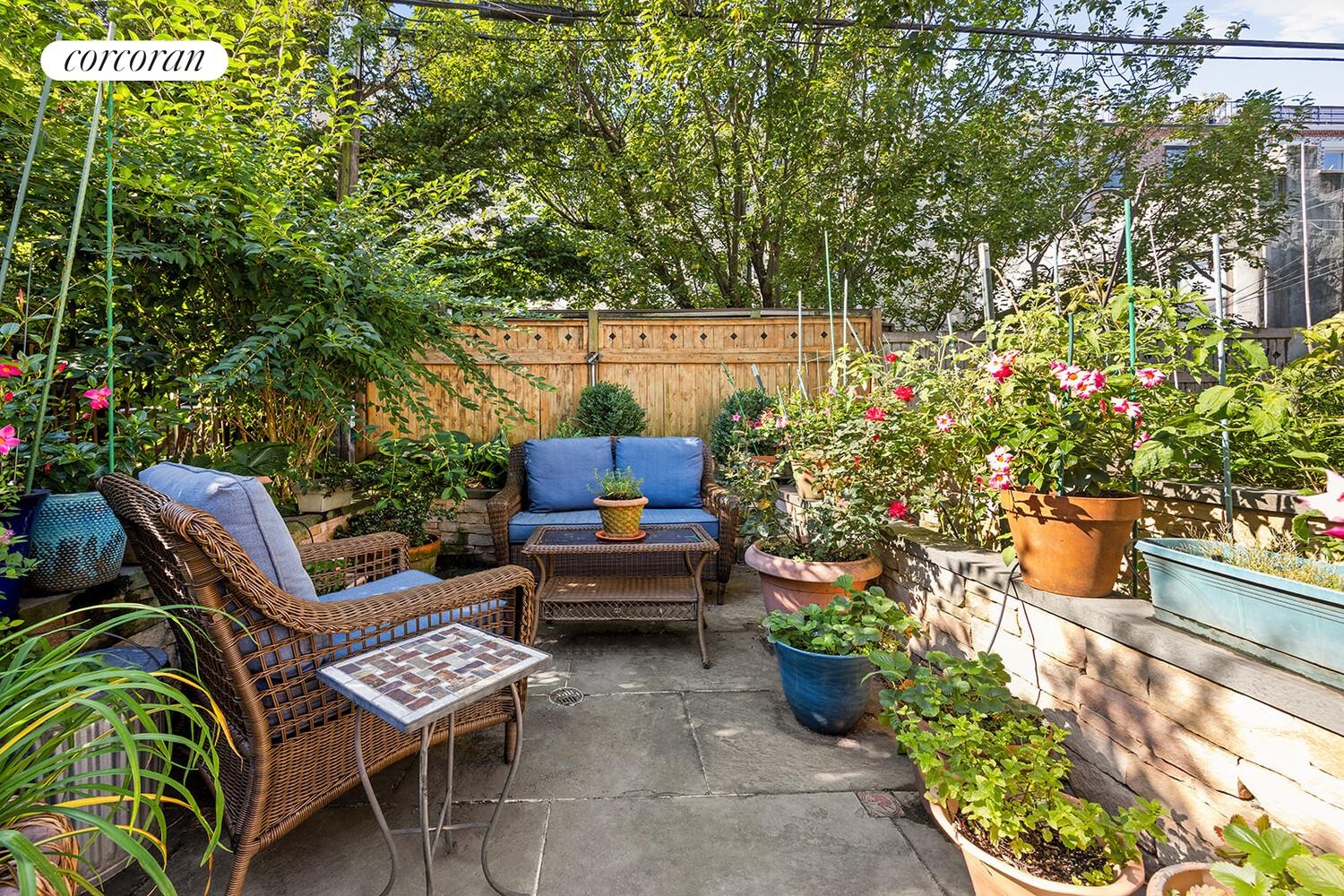 Up the stoop, the sunlit parlor level unfolds with a decorative fireplace, striking woodwork, and inlaid parquet floors. The formal dining room flows effortlessly to a bright rear kitchen, which opens directly to a landscaped garden, a private outdoor escape for al fresco dinners, weekend lounging, and easy everyday living.