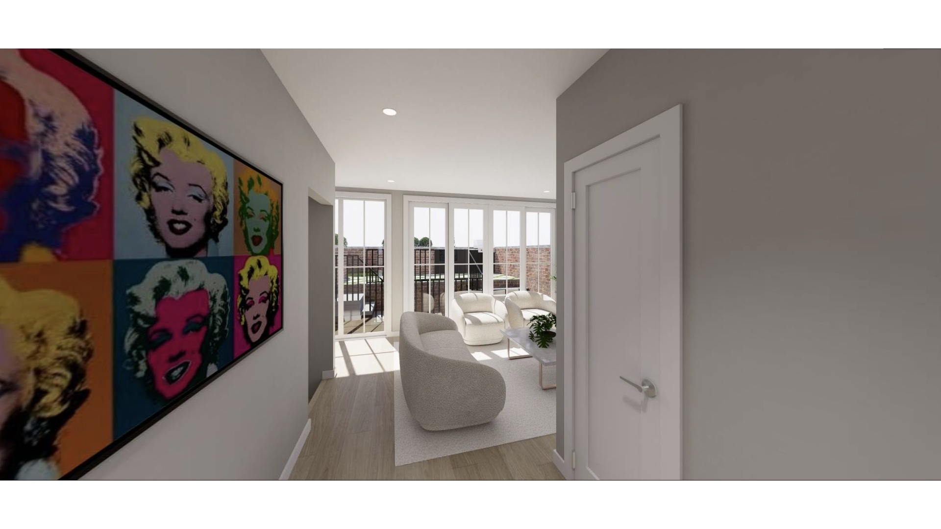 The owner's duplex features a grand salon on the main level spanning over 28 feet long, creating an impressive reception area with open living and dining areas, a stunning kitchen and a powder room. The centerpiece of the kitchen is a massive quartz island, which is perfectly framed by high-end Viking appliances and custom solid wood cabinetry.