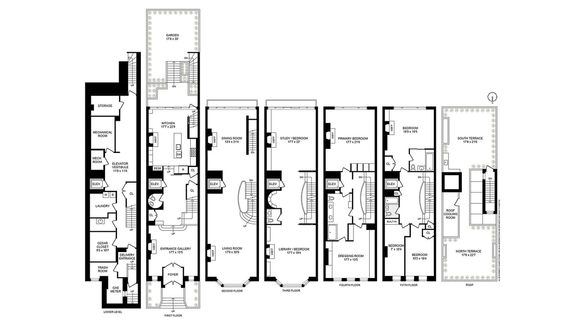The 4th floor master bedroom, bathroom and dressing room remain a private area, bathed in sunlight during the day and quiet at night. The bright and airy fifth floor has a bedroom with ensuite bath, a gym and an office (both of which can easily be repurposed as bedrooms) with a shared bath off the landing.