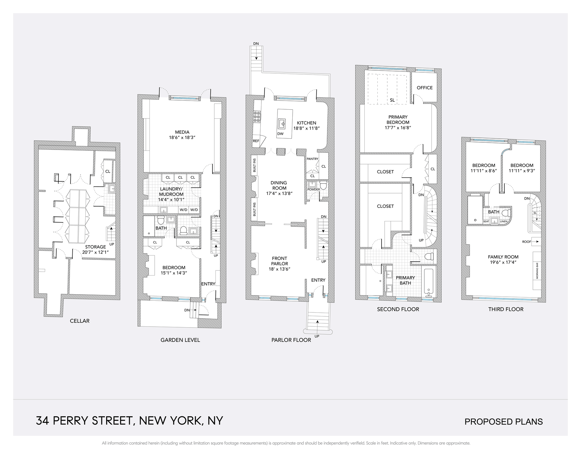 Originally constructed in 1845, this 21-foot-wide single family townhouse spans nearly 4,000 square feet and sits on a deep 95-foot with a clear south-facing garden. Period moldings, eight fireplaces, and generous scale abound, particularly on the top level with a wall of steel casement windows and north-facing skylight crafted in 1924 for New Yorker cartoonist Al Frueh. Proposed plans (already approved) envision an approximately 4,600 square foot masterpiece with a sizeable rear extension allowing for a large eat-in kitchen on the parlor level in addition to a double parlor, a media room opening onto the garden one floor below, and a spacious full-floor primary suite with private office, windowed bath, and two large dressing rooms. Three secondary bedrooms, a top floor family room with ceiling heights reaching 15 feet, large mudroom and laundry facilities, and meticulously conceived storage complete this residence.