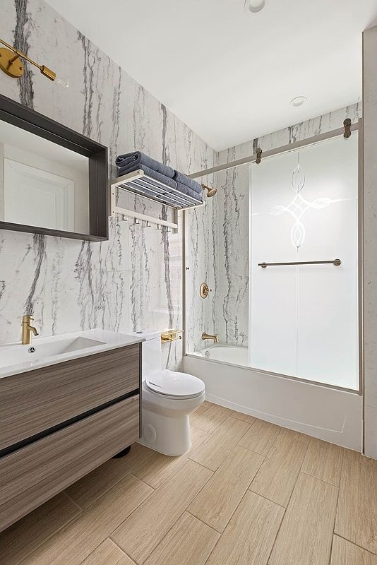 Upstairs, the owner’s suite accommodates a king-size bed and features a spa-inspired en suite bath with floor-to-ceiling stone, a soaking tub, walk-in shower, and double vanity. Two additional bedrooms share a large, windowed full bath, and a washer-dryer adds convenience.