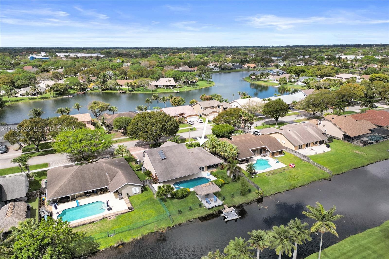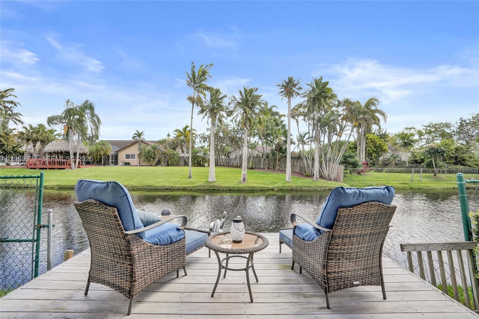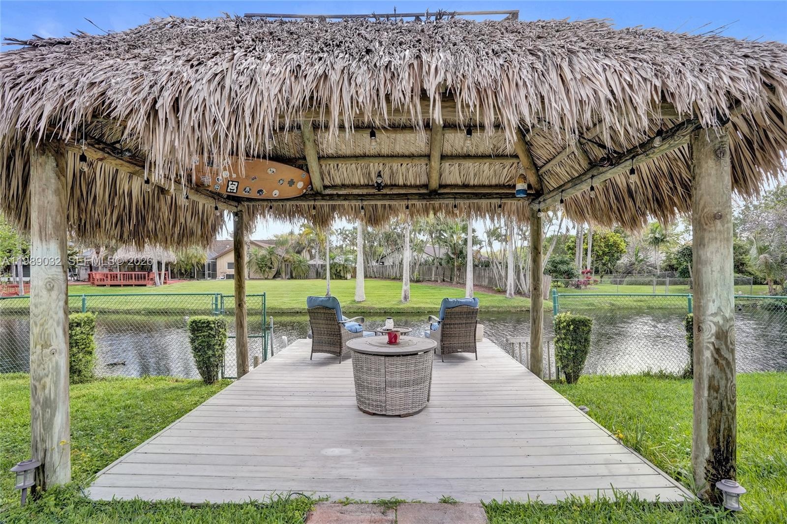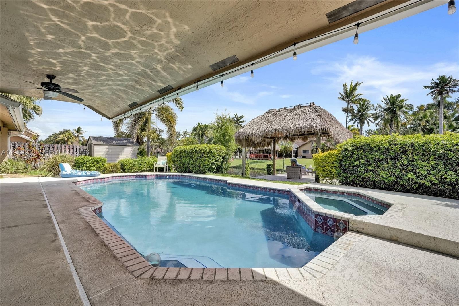 Step outside to your private oasis featuring a heated pool with a jacuzzi, and a newly added tiki hut retreat overlooking the water with a small dock for boating—ideal for relaxing or entertaining.
