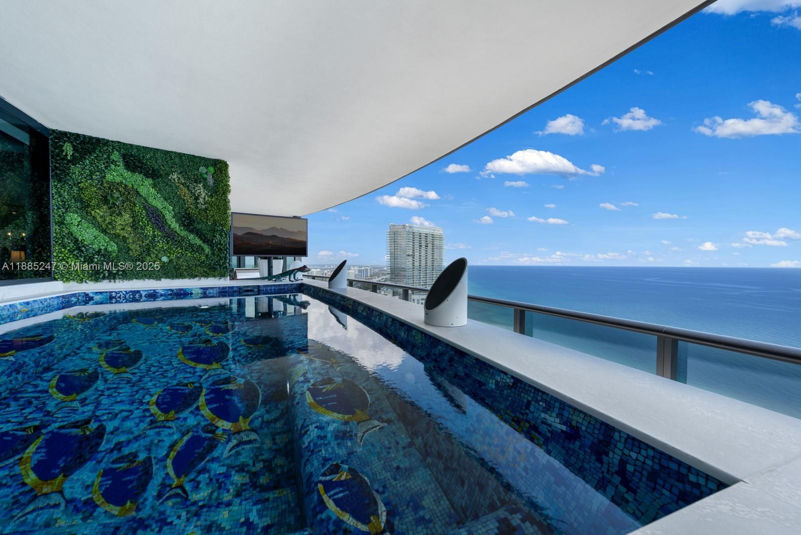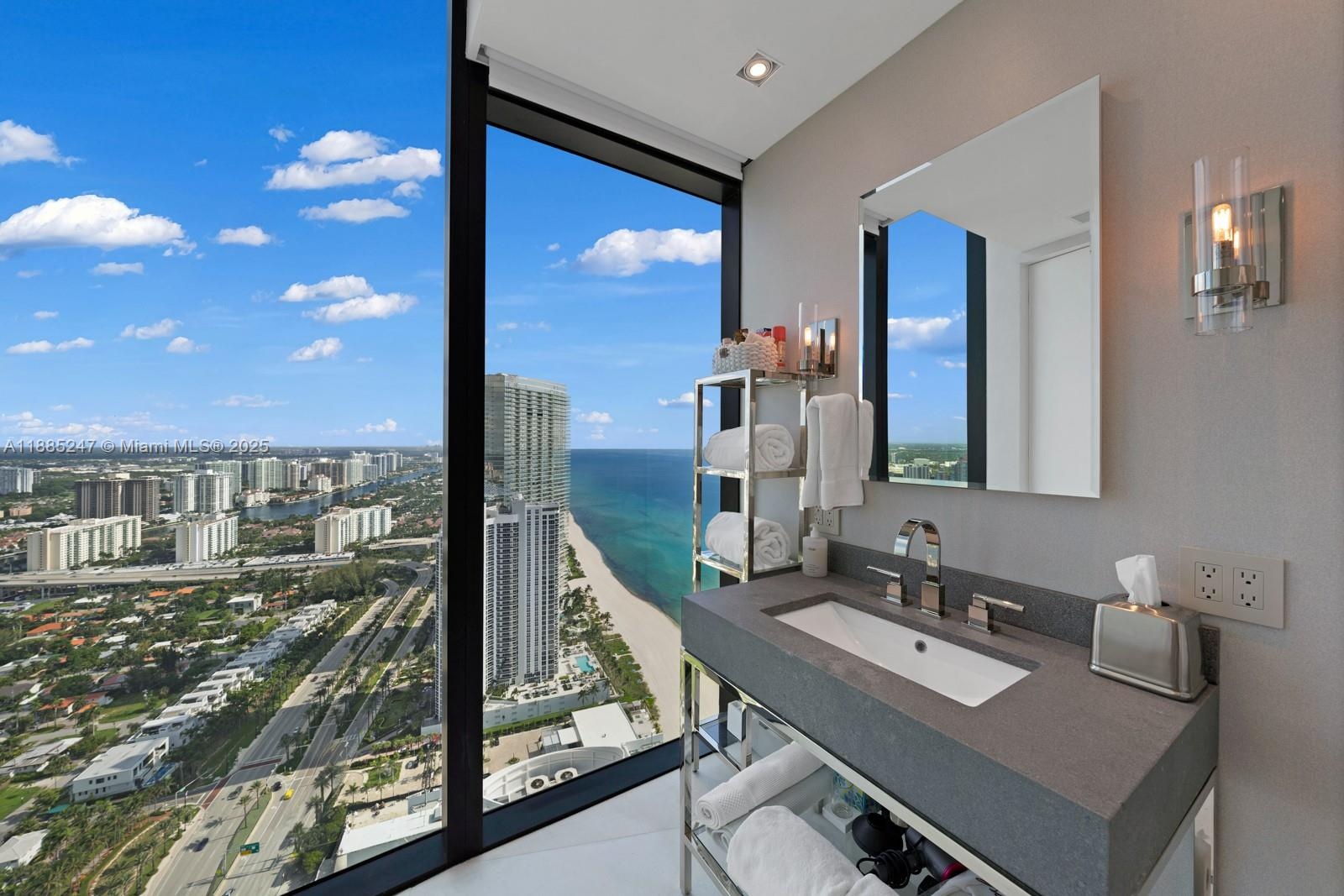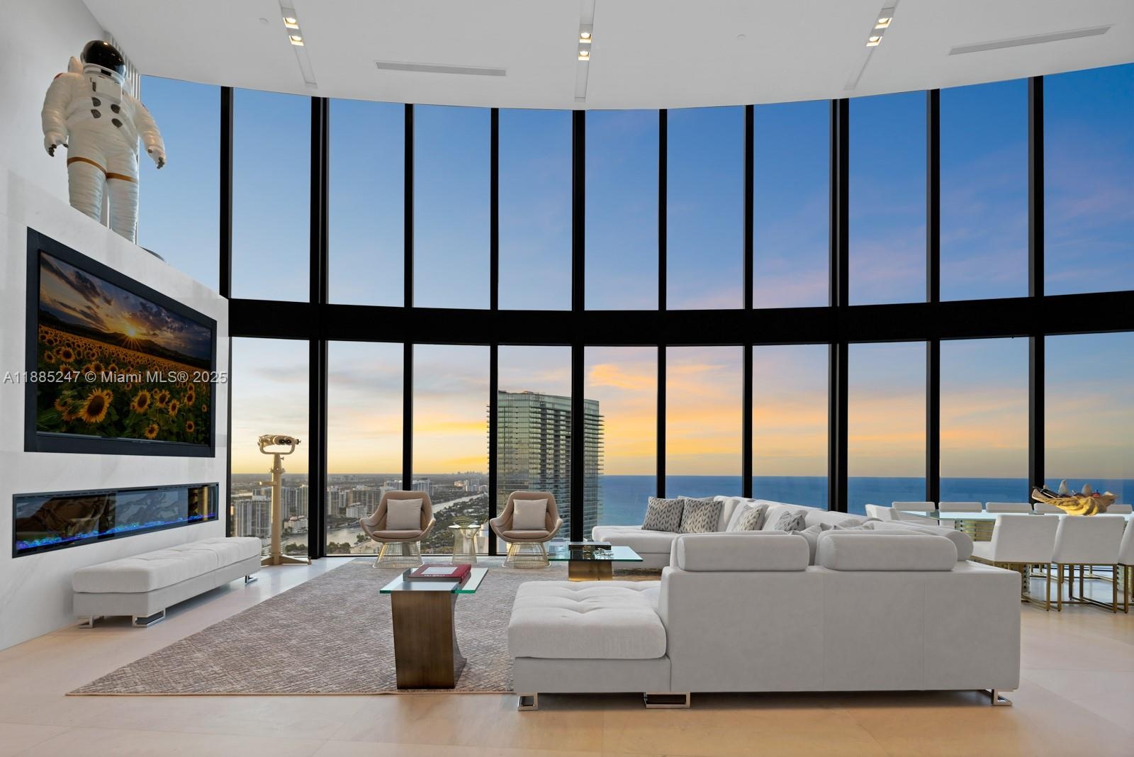 Crown Jewel Penthouse at Porsche Design Tower. This 2-level oceanfront residence features soaring 22-ft ceilings, custom wet bar, 98" Sony TV, MiaCucina kitchen with Wolf & Thermador appliances, & a striking Cetta 1800-bottle wine cellar. The primary suite includes Ornare closet, office & gym. Expansive terraces boast a mosaic-tiled pool, fire pit & summer kitchen. Fully Lutron automated Savant, 14 TVs, 3 fireplaces & 4-car sky garage with private elevator. A mansion in the sky, completely reimagined turnkey with exquisite upgrades & flawless finishes. This smart home showcases breathtaking ocean, city & Intracoastal views—set in one of the worlds most exclusive boutique buildings with unmatched privacy & the iconic Dezervator that seamlessly parks you & your car directly inside your home.
