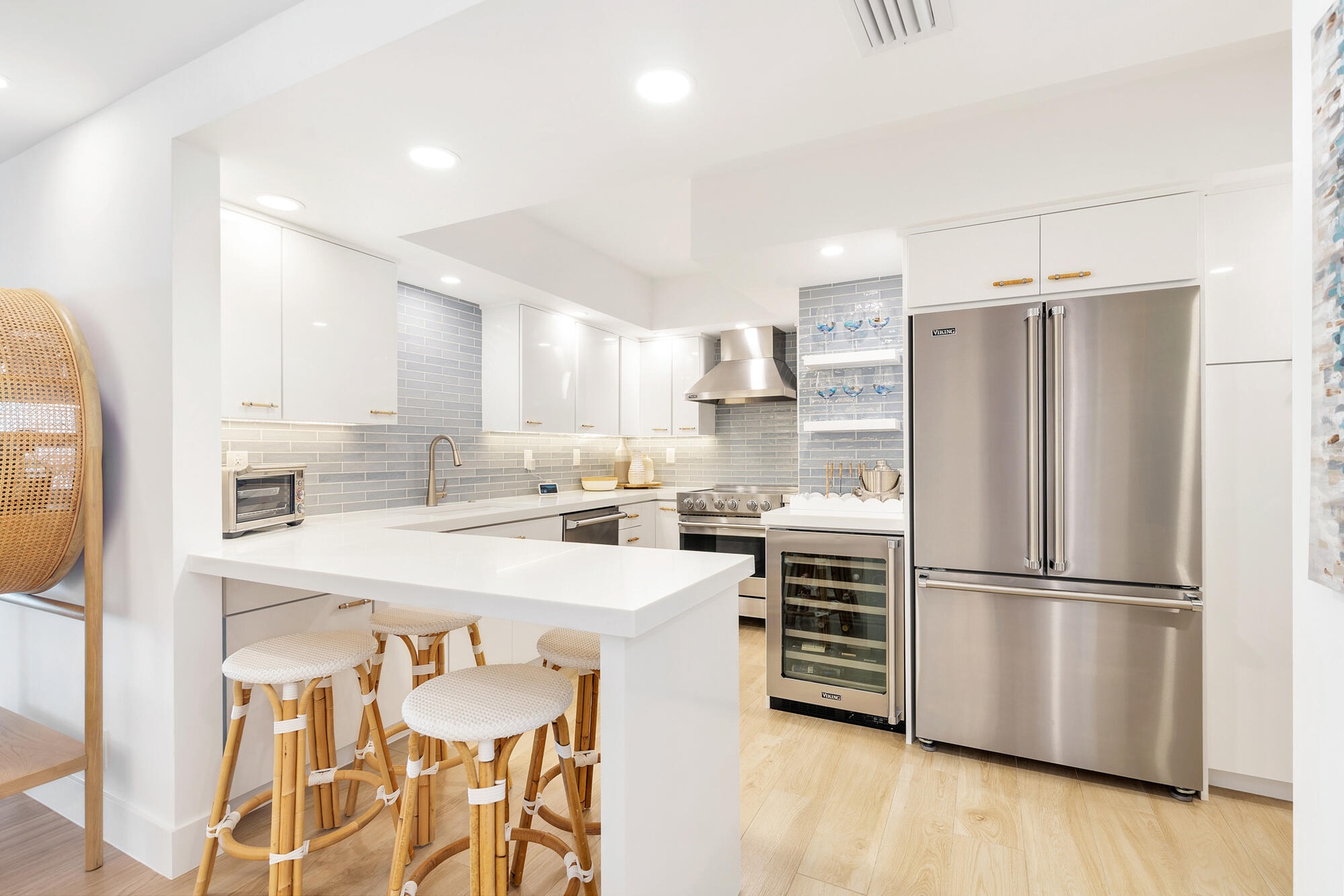 UNOBSTRUCTED Intracoastal and sunset views from living areas and both bedrooms. Enjoy spectacular sunsets and water vessels from inside or from your spacious terrace. This stunning home offers wood-like porcelain floors, custom wall paper, an open kitchen with breakfast bar and virtually brand new Viking appliances including an induction stove/oven. This property is being offered beautifully furnished with just a few exclusions. The Meridian is a gated oceanfront community with 1 car garage parking, 2 storage lockers, tennis, fitness room, resort style pool - and direct beach access.