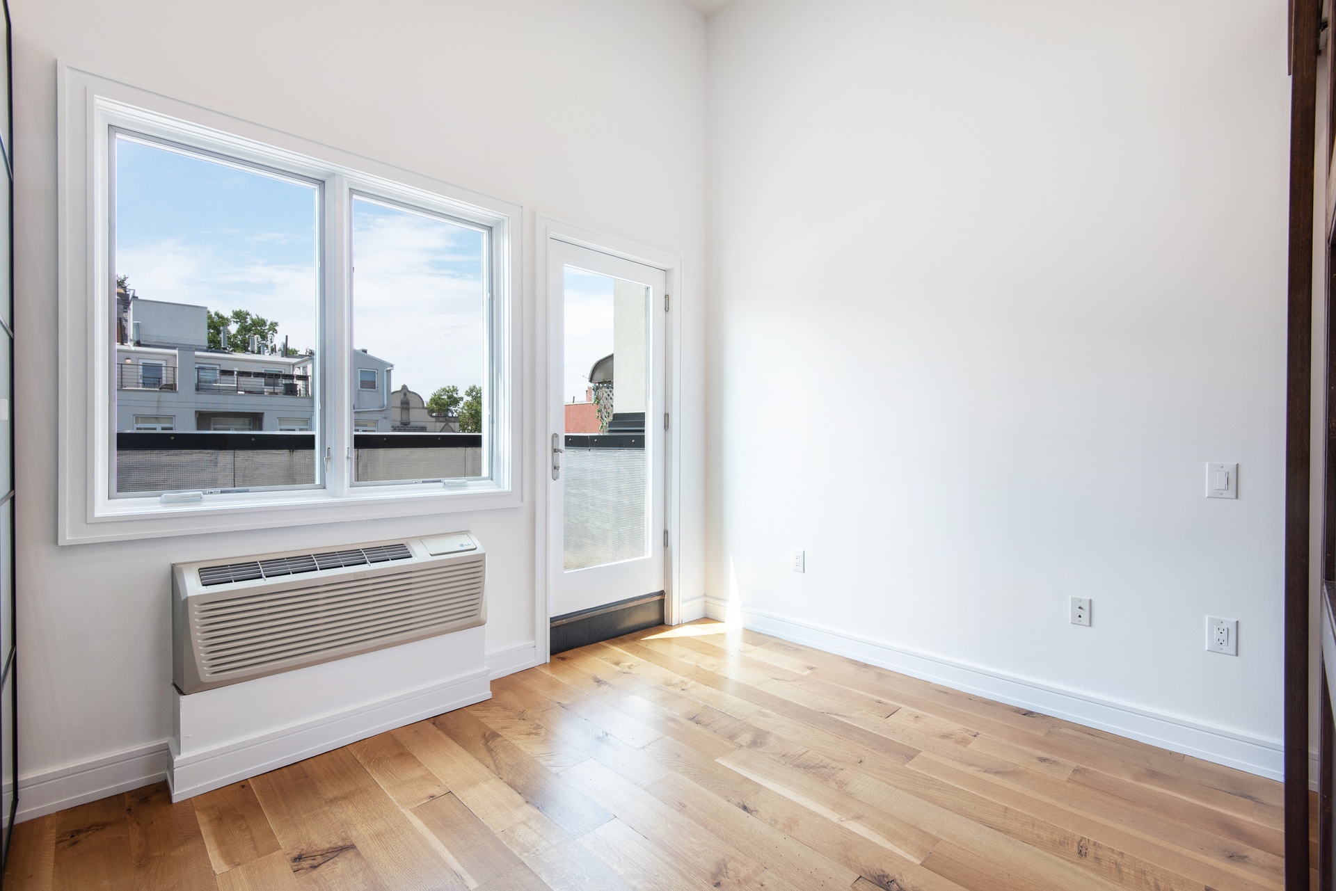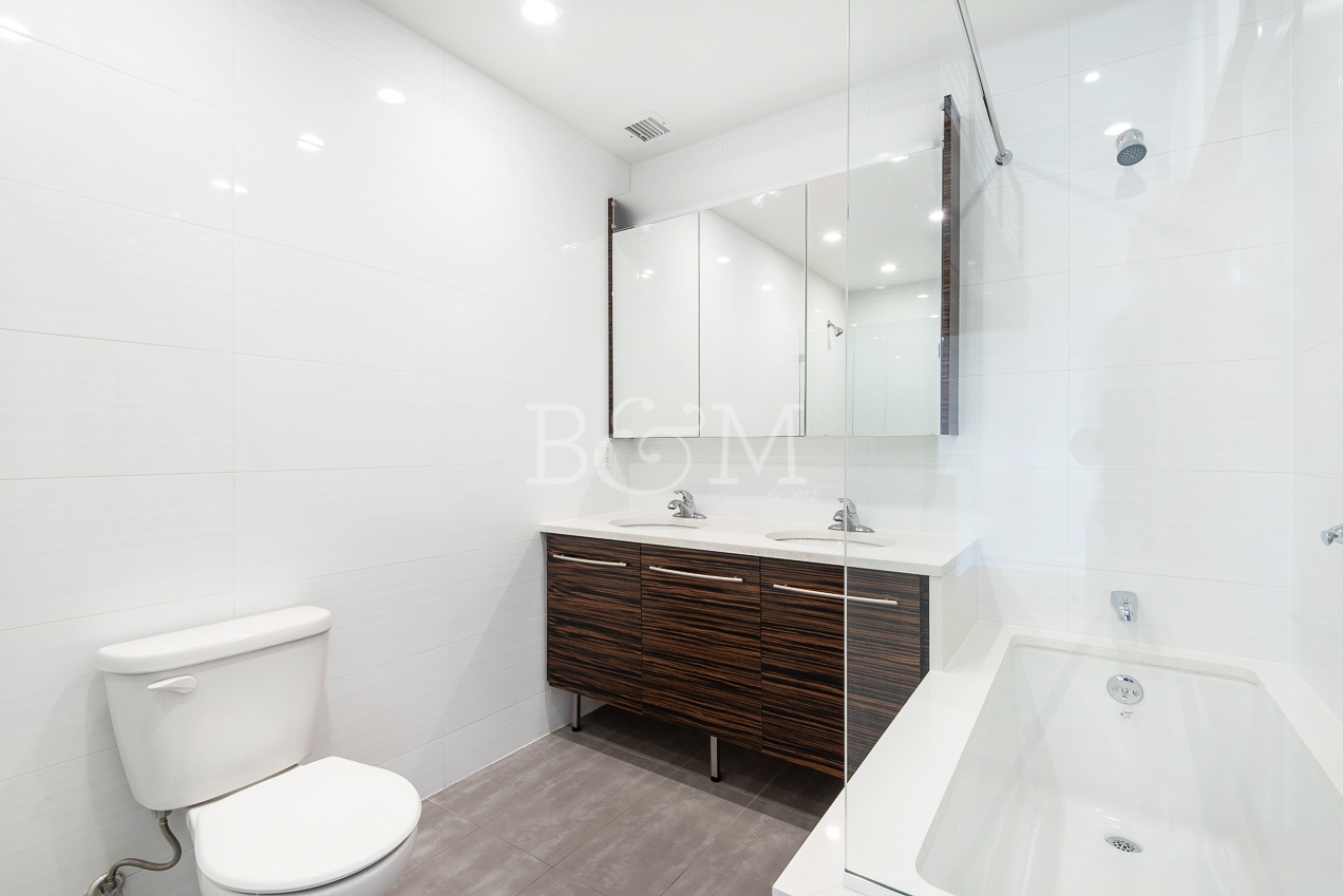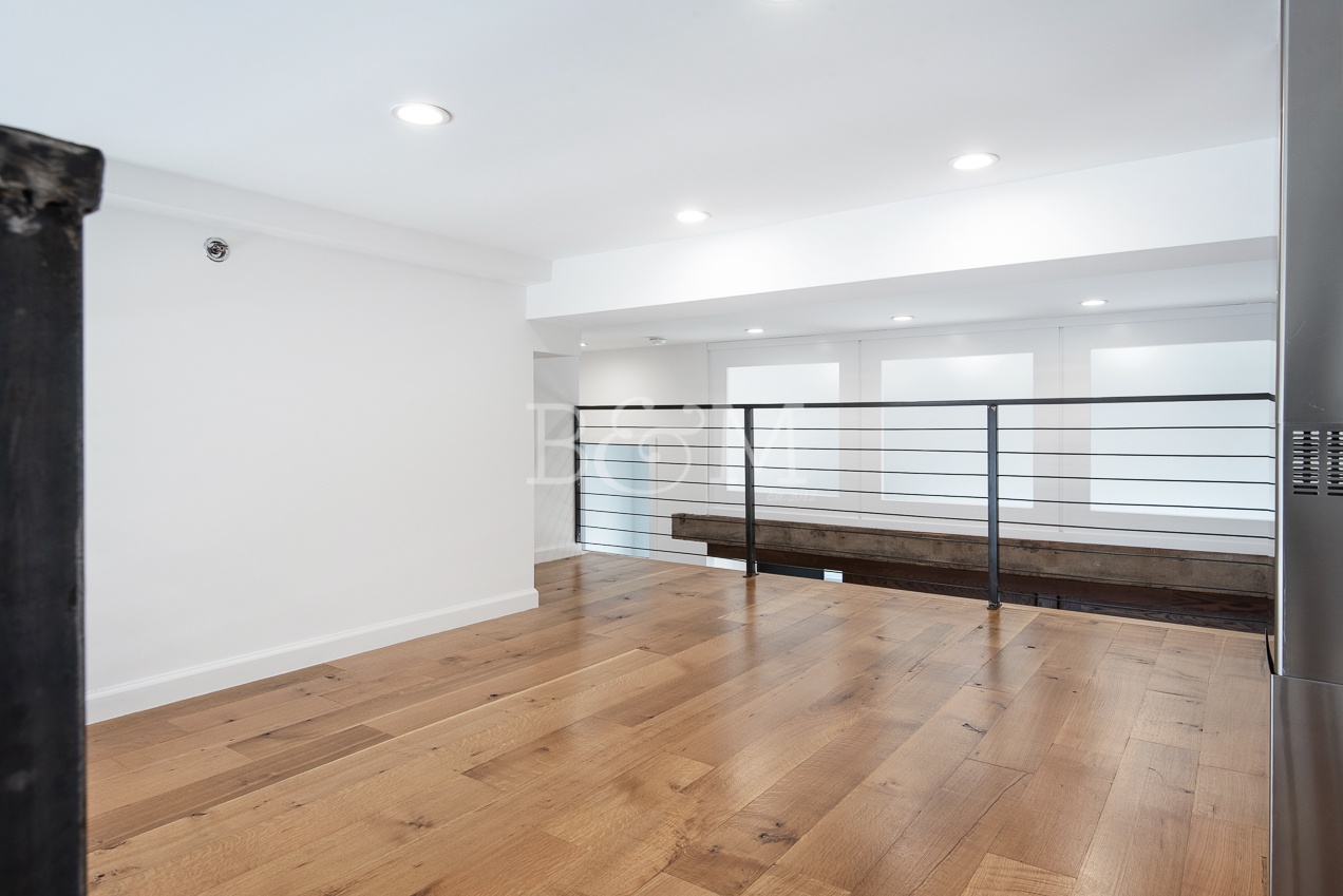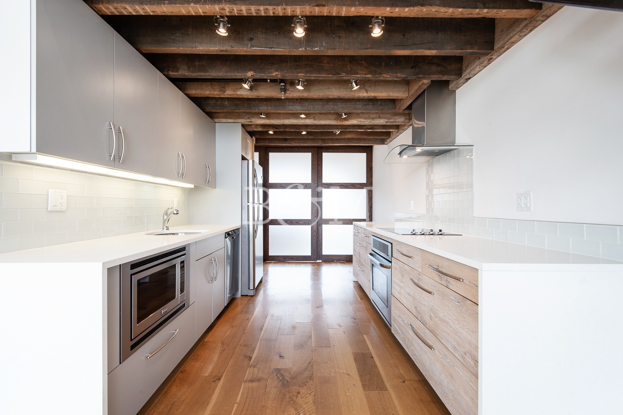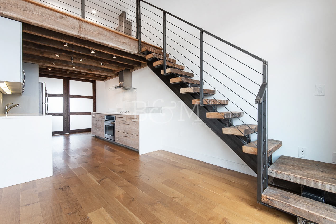This penthouse 2-bedroom home looks over two large terraces at the front and rear of the building. The north facing terrace off of the living room is a large space that easily fits a 6 person dining table, lounge chairs, plenty of plants, and a bbq grill. The terraces include lighting, power, and water. The interior boasts a double high ceiling with a mezzanine over the kitchen that is a great space for storage or other creative uses. The finishes include rustic wood floors, recessed lighting, spot lighting in the kitchen, loft like features such as a smoked glass sliding doors to one of the two bedrooms, in-unit washer dryer, and more.