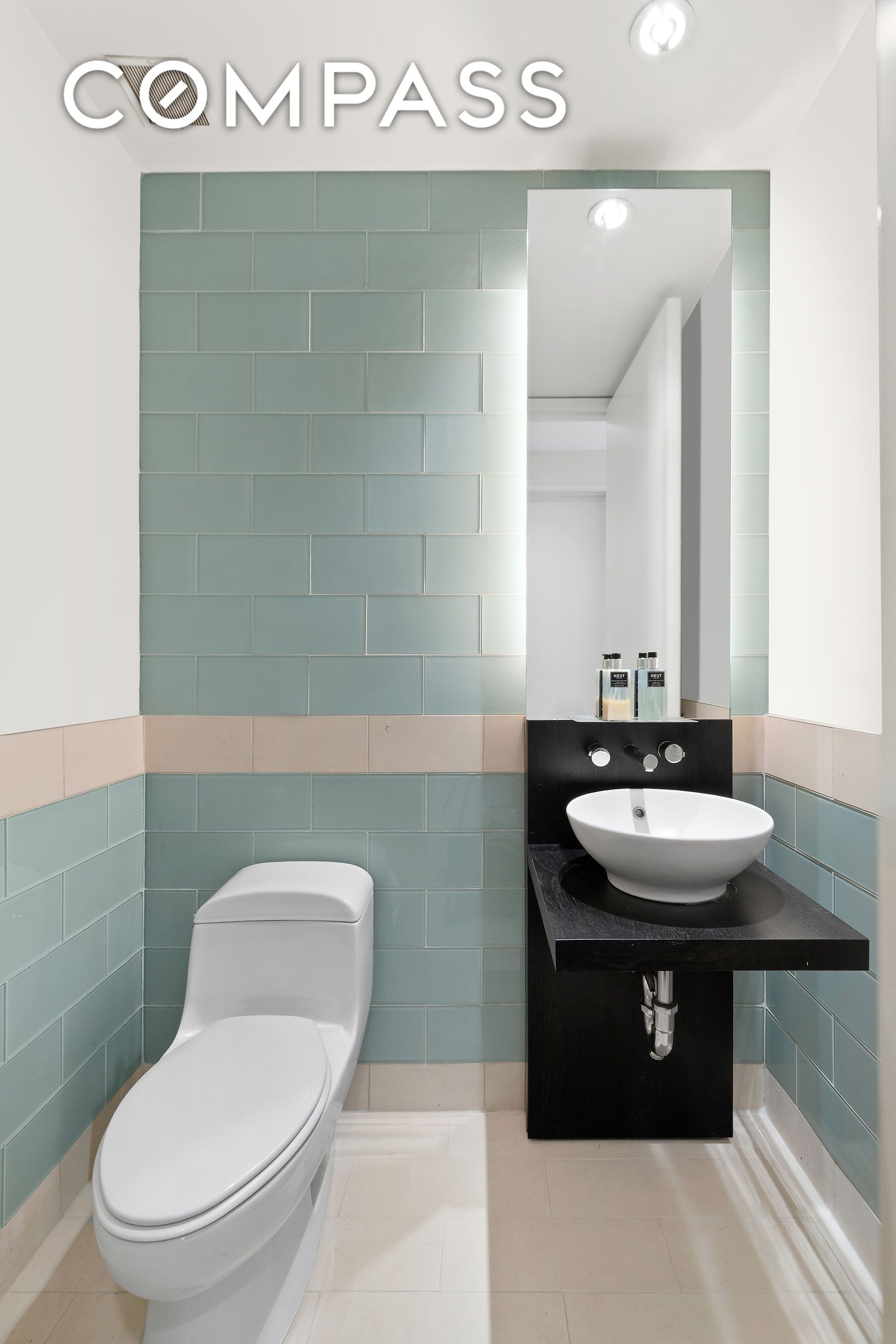 The primary suite is set apart and includes a five-fixture bathroom and a fully built-out walk-in dressing closet. The second bedroom has its own en-suite bath, and there is a powder room for guests.