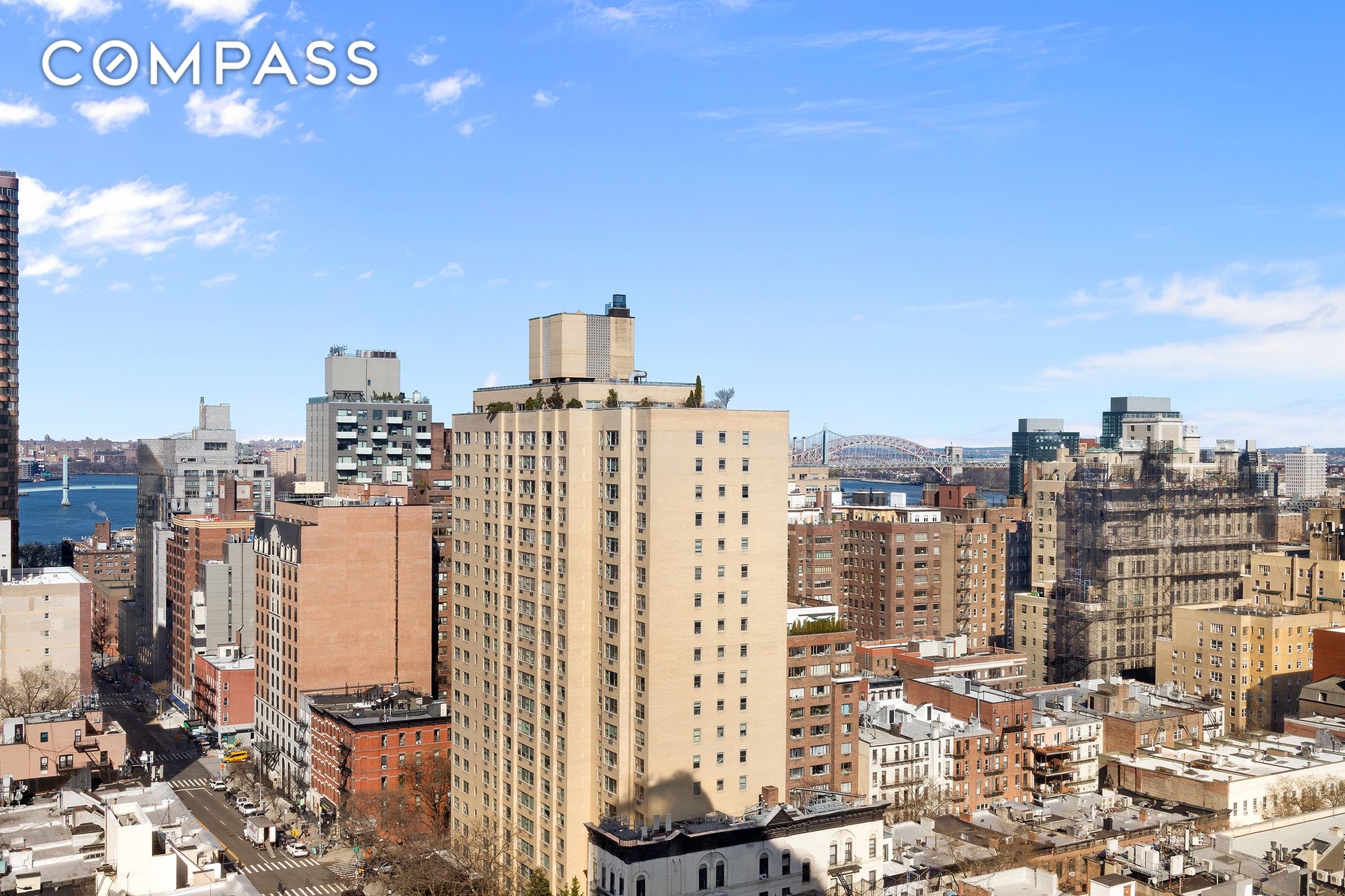 This 2-bedroom, 2.5-bathroom condo offers 1,581 square feet of interior space on a high floor of a modern high-rise. The apartment faces west and north, with open sunset views and northern river views.