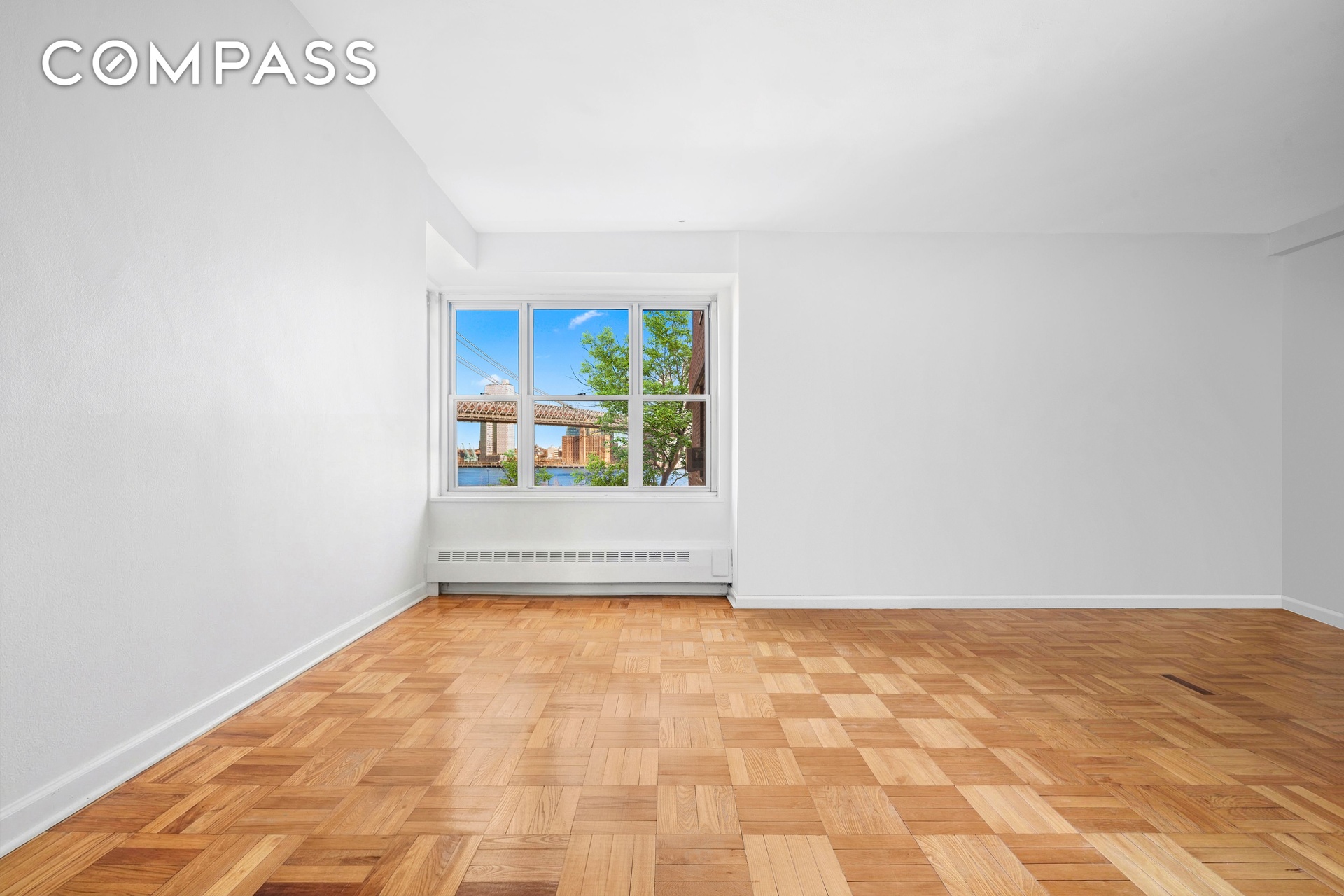 A thoughtful hallway provides perfect separation between the entertaining areas and the quiet sleeping quarters. The primary suite is a true retreat, easily accommodating a king-sized bed plus additional furniture, complemented by large west-facing windows and a deep closet. Its windowed en-suite bathroom serves as a soothing sanctuary with a glass shower, beautiful subway tiling, and a warm wood vanity. Two additional oversized bedrooms—a rare luxury in NYC—each comfortably fit a queen-sized bed and furnishings while offering serene views of the bridge and river. A second full bathroom with a soaking tub and two additional hallway closets complete this thoughtfully designed home.