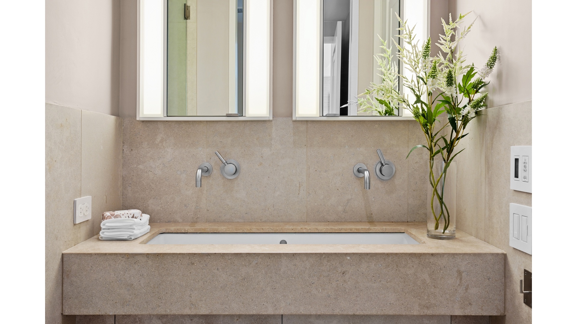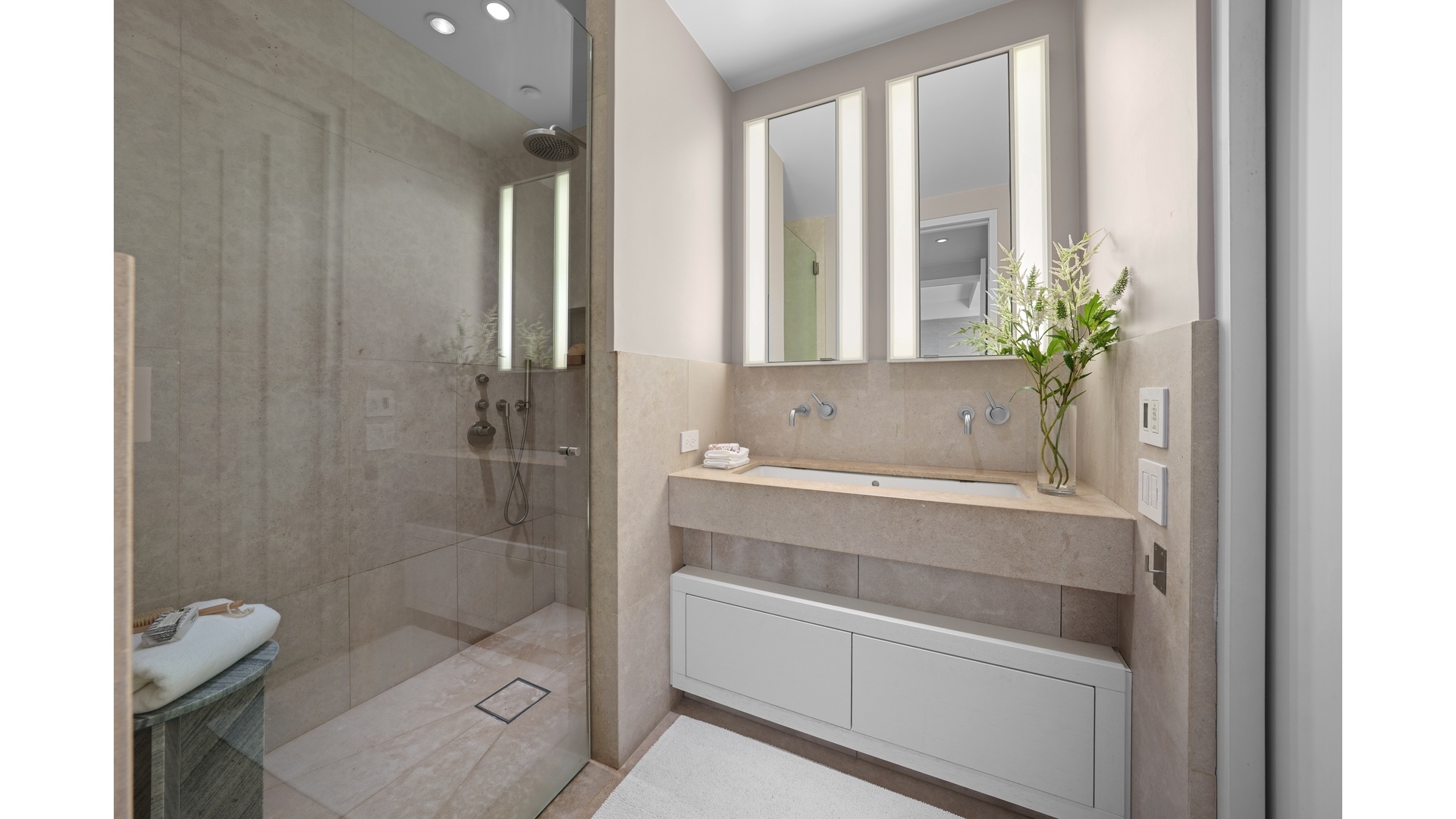 The grand bedroom is a tranquil retreat with its stunning dual entrance designer bath (also created in Chambolle Limestone) and both a luxurious Kaldewei soaking tub and extra-large shower with rain head.