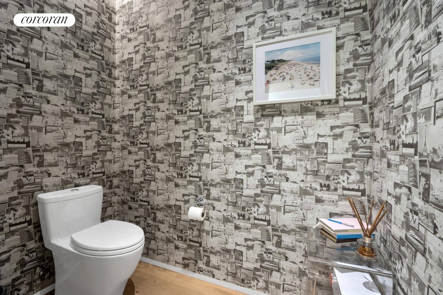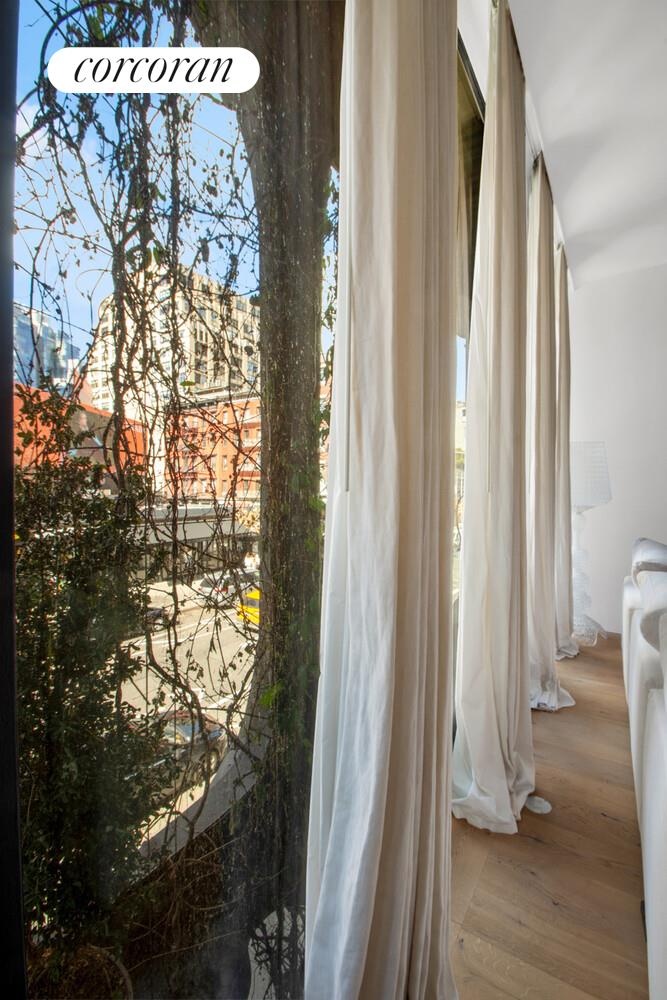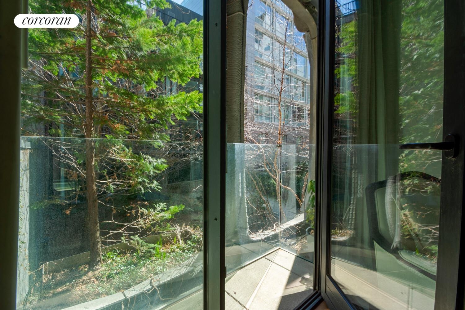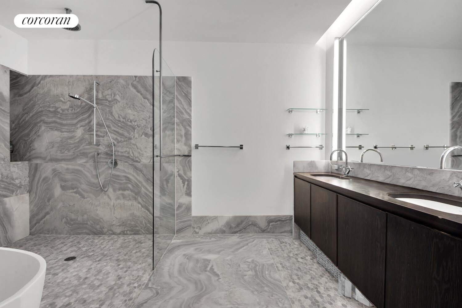 The tranquil primary suite offers bright eastern exposures overlooking a leafy landscaped garden and features a private balcony. An enormous walk-in dressing room provides abundant storage, while the spa-like five-fixture primary bath is finished with honed Gray Argento marble floors and walls, a Black Saint Laurent marble-topped dual vanity, and custom Austrian white oak cabinetry. A sculptural freestanding soaking tub, separate rain shower, and elegant cove lighting create a serene retreat, complemented by polished chrome Dornbracht fixtu res throughout. A dual-flush commode is discreetly set in a separate room with custom Andrew Martin wallpaper for added privacy.