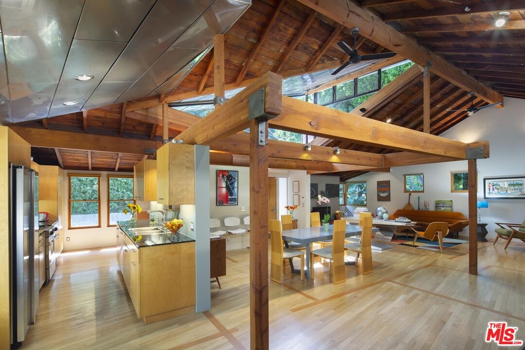 While "space for creative living" is overused in the real estate industry, the proclamation is an apt description of the Mahler/Adams House, 1924-1998, by architect William Adams. Noted as the long-time studio and residence of sculptor Anna Mahler, Adams made the space his own by daringly removing the living, dining, kitchen, and bedroom walls and ceilings, and opening the roof. The result is an inspiring new space for modern Canyon living. The warm, high-ceilinged, wood-beamed live/workspace with fireplace flows seamlessly into a modern kitchen with stainless steel appliances, dining banquette, and bedrooms. An oversized hillside sundeck, sheltered by a canopy of shade trees, affords sylvan canyon vistas, making it the perfect place to unwind or host friends. The carport, parking pad and driveway allow for off street parking for up to 6 cars. The Mahler/Adams Residence offers an artful blend of rich, bohemian history and warm contemporary architectural significance.