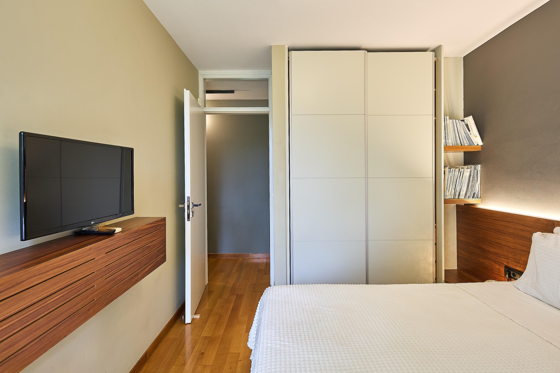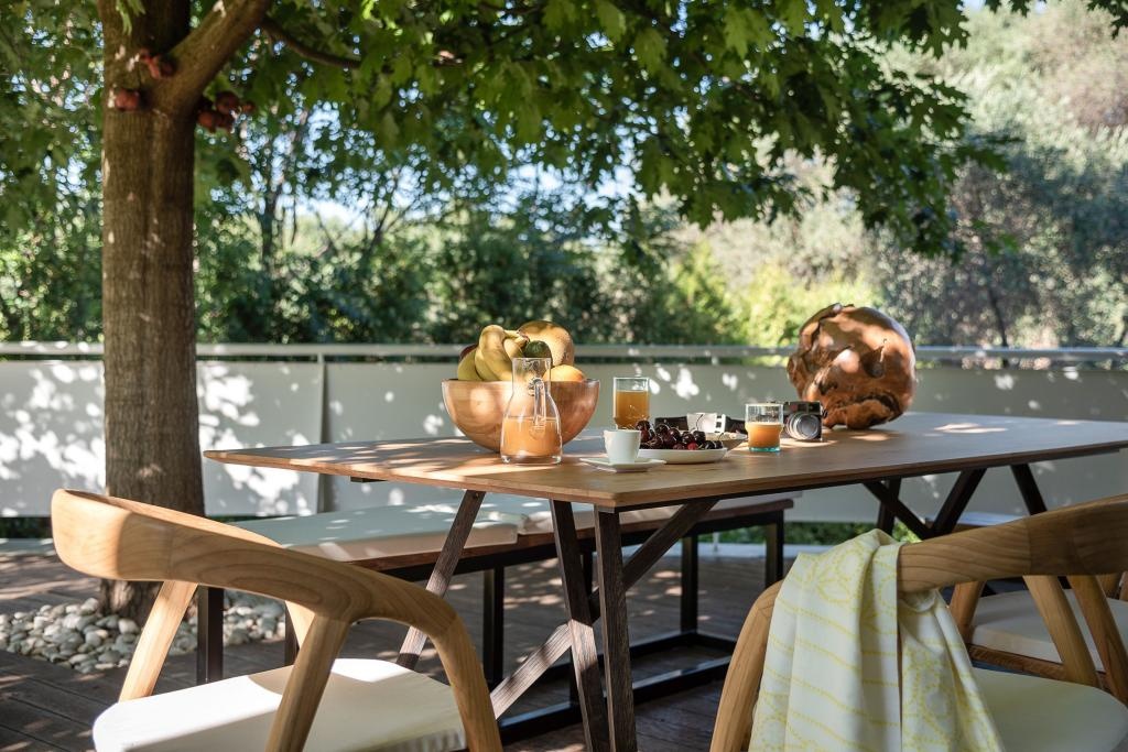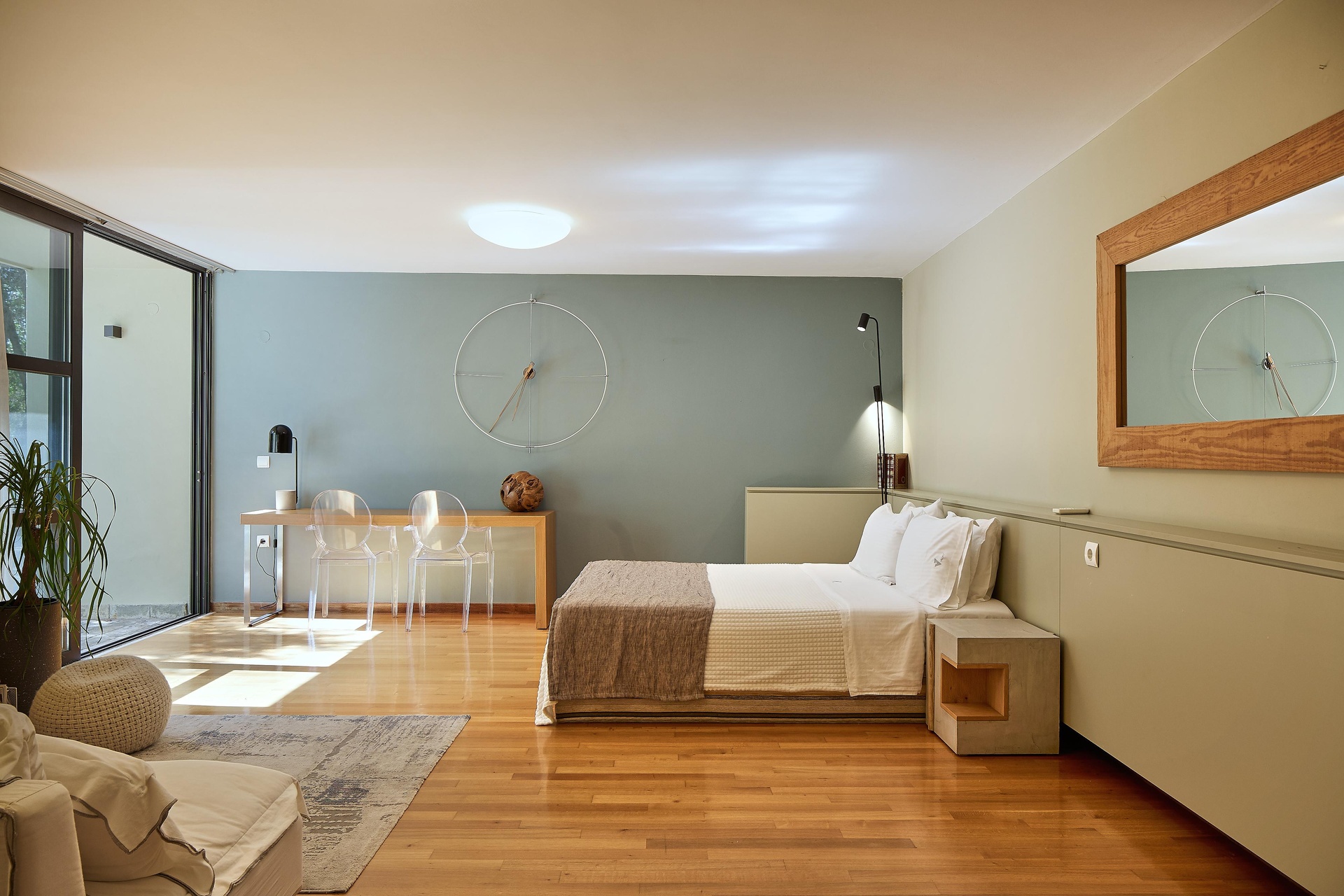 On that level guests may find a 50m2 studio, featuring a king size bed (1,60 x 2,00), a double sofa where the 9th guest can sleep, a minimal design Danish clock with wooden indicators, en-suite bathroom with shower cabin, as well as a well equipped kitchenette. The studio offers access to the outdoors including the barbecue and pool area. Furthermore, pilates exercise equipment and free weights, as well as the villa’s washing machine and clothes dryer are located on this level.