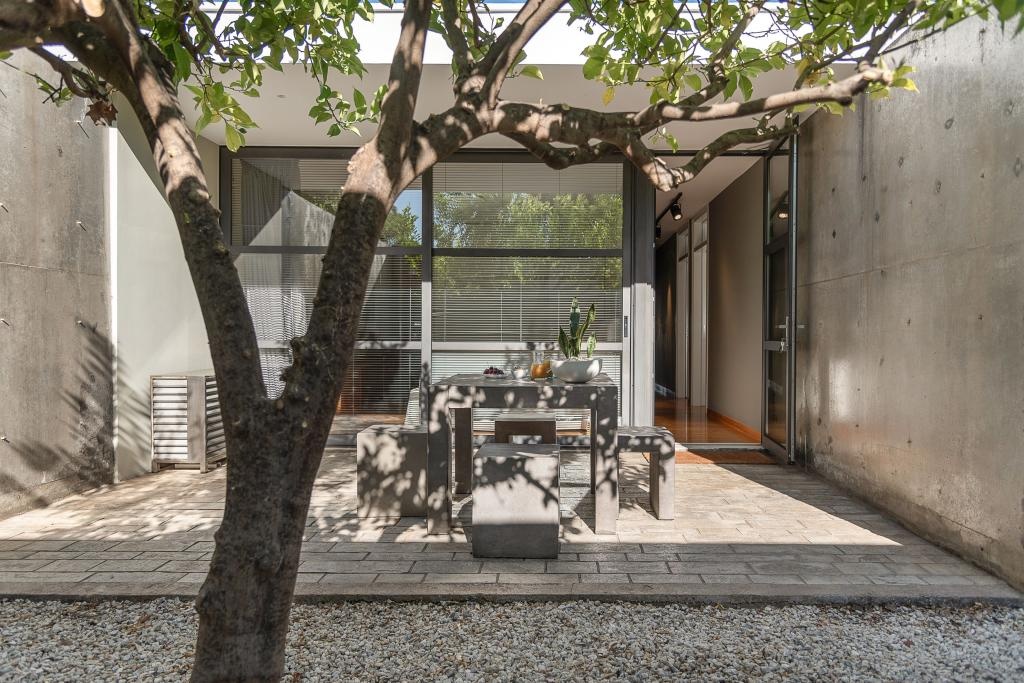 The office features an oak wood working desk and library, as well as a stylish recliner,which guarantees a quiet and calm area for studying or working. The office opens out to the same private patio as the master bedroom. The outdoor patio furniture is a minimal design: together with white gravel paving, it constitutes the patio area where the concrete elements embrace the structure.
