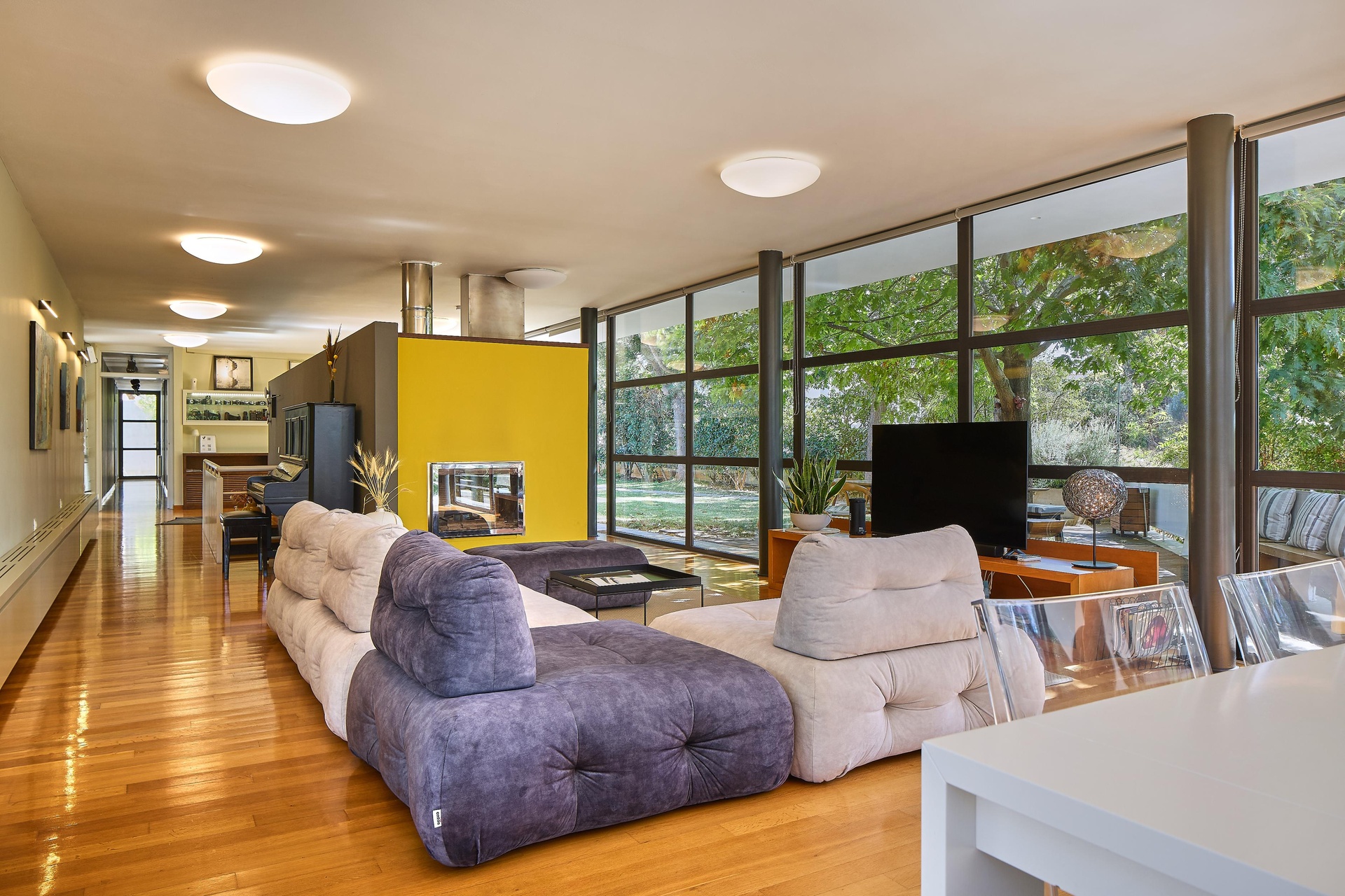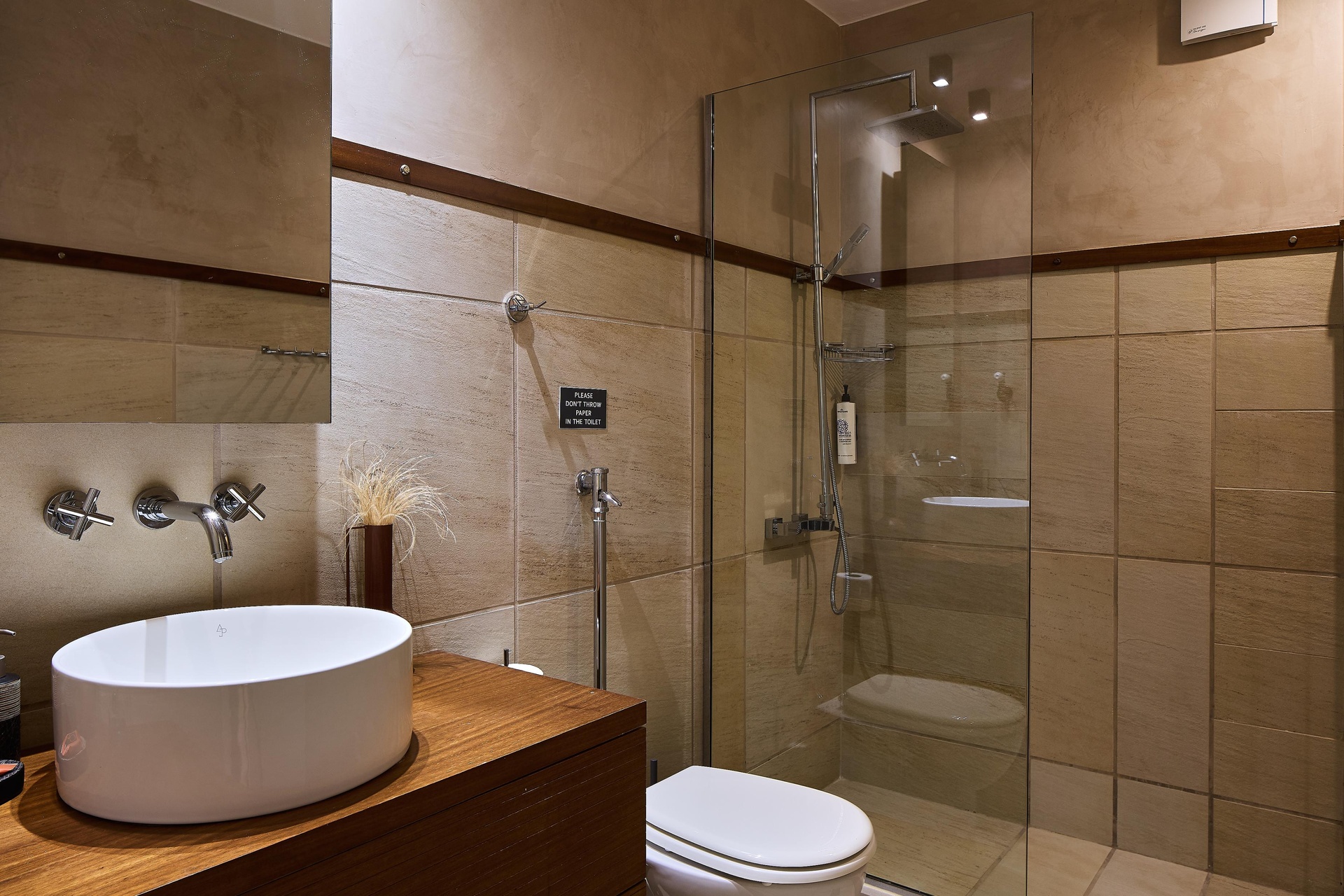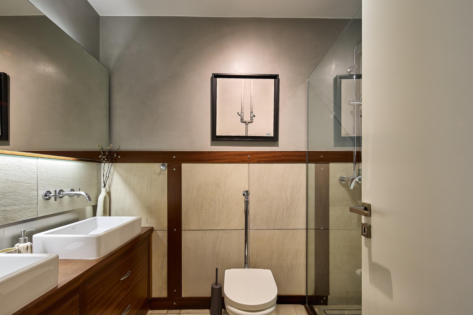 From the main entrance, the ground level welcomes you with a spacious open glass area leading to a comfortable living room with a corner sofa, a 50” TV with Netflix, Bluetooth speaker, and a fire place. Next to the living room is a stylish dining table that seats 8 guests and fully equipped kitchen. Plenty of natural light enters the space through the glass walls giving an airy feel. Oil paintings and