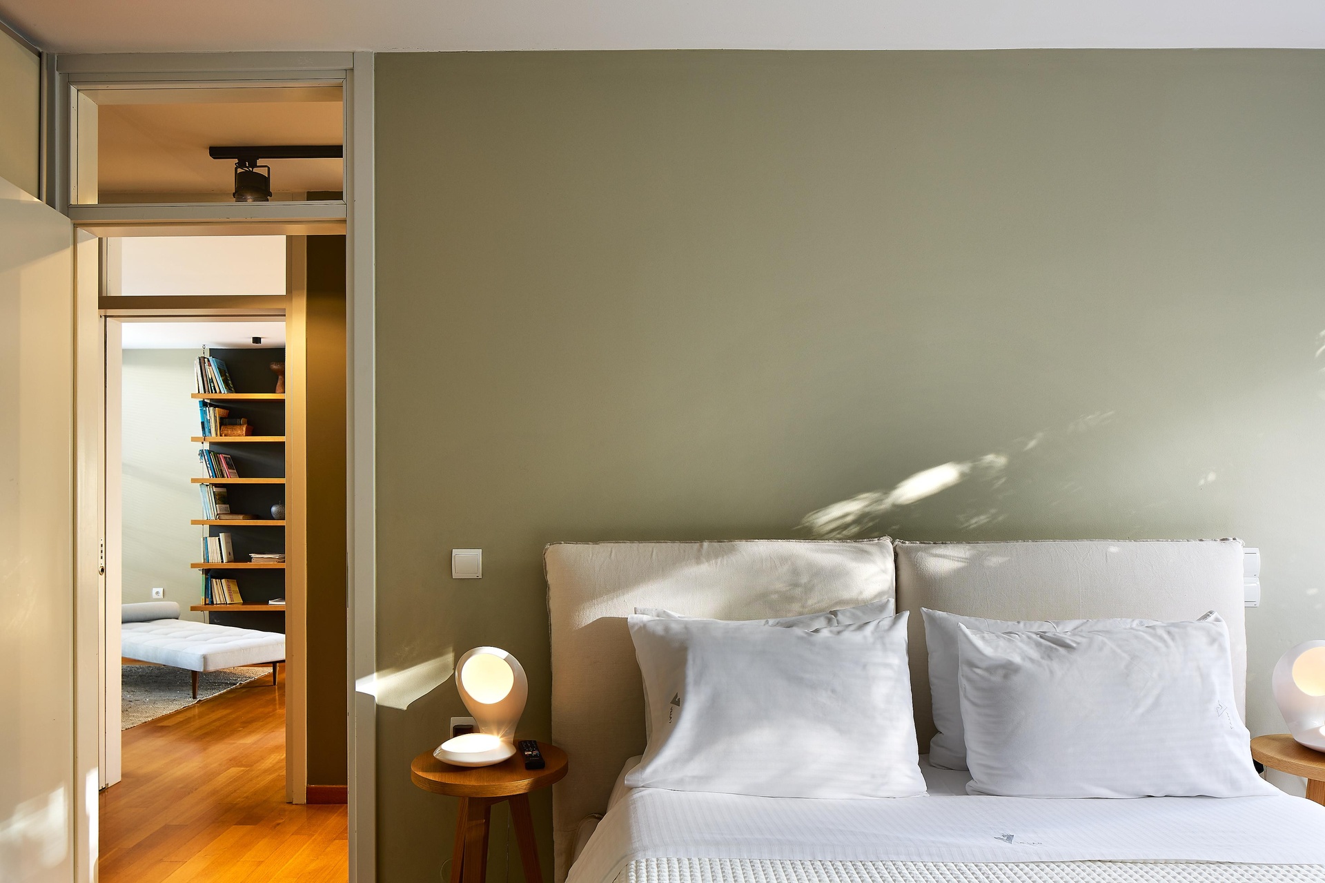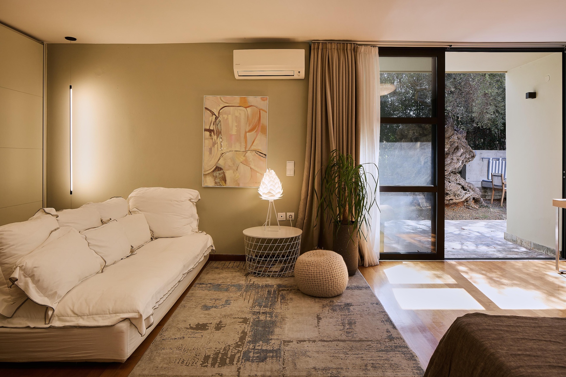 Walking along the corridor on the same level, you will find three stylish bedrooms, a minimally designed bathroom and a spacious office. Specifically, the first bedroom features two single beds (0,90 x 2,00) that can be joined to create a King if necessary, AC, 27” TV, close,t and direct access to the outdoor area. The second bedroom features a Queen- size bed (1,60 x 2,00), AC, ceiling fan, 27”TV, closet and direct access to the outdoor area. The master bedroom features a Queen-size bed (1,60 x 2,00), an ensuite bathroom with a shower, A/C, 49” smart TV, closet, safe, and access to a private patio with a lemon tree. Additionally,y there is a family bathroom with double sinks and a shower cabin on this level.