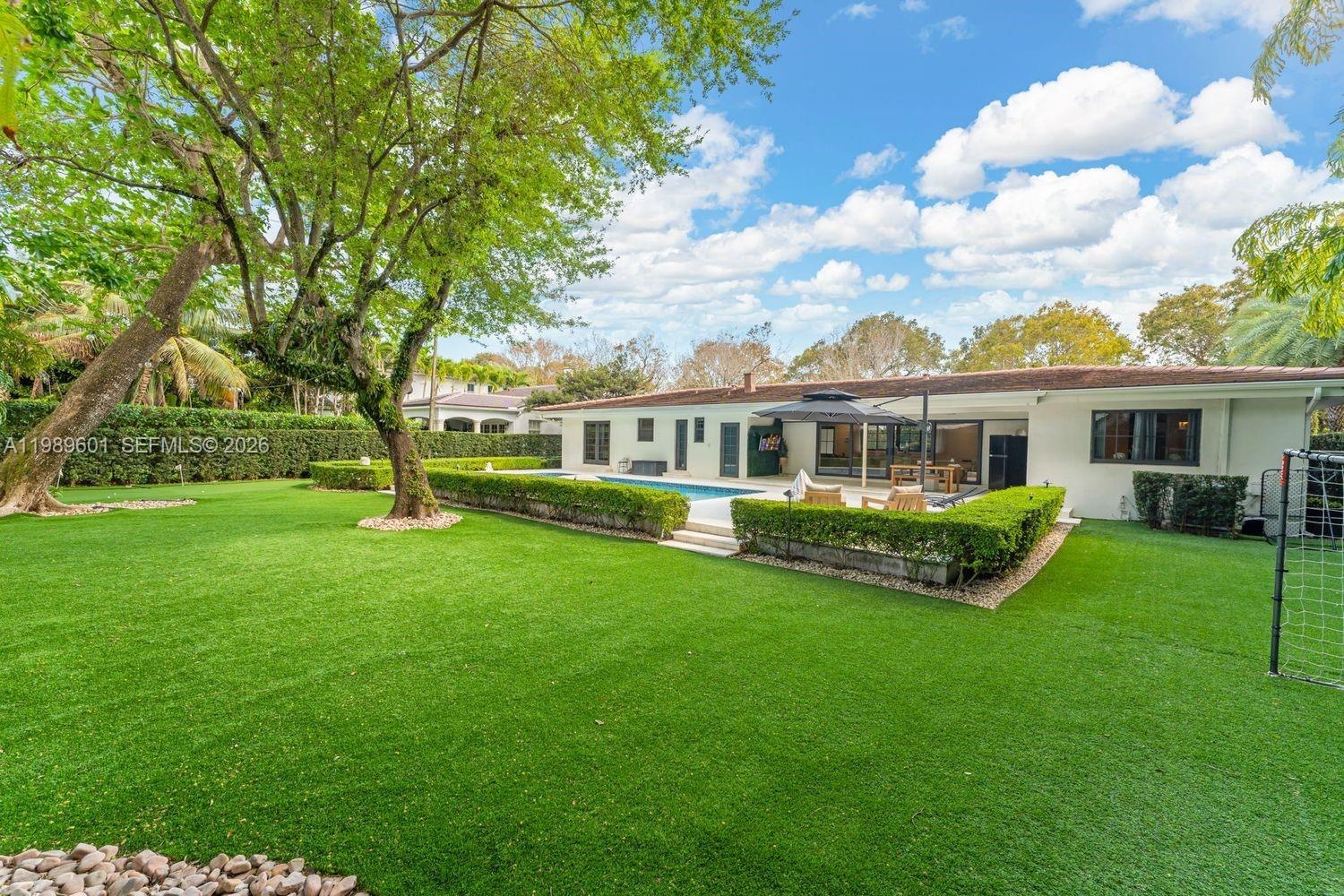 The backyard is a private retreat with a sparkling pool, covered terrace, lush greenery, and a custom putting green, ideal for relaxation and recreation.