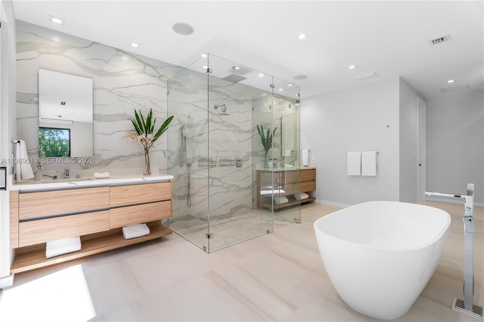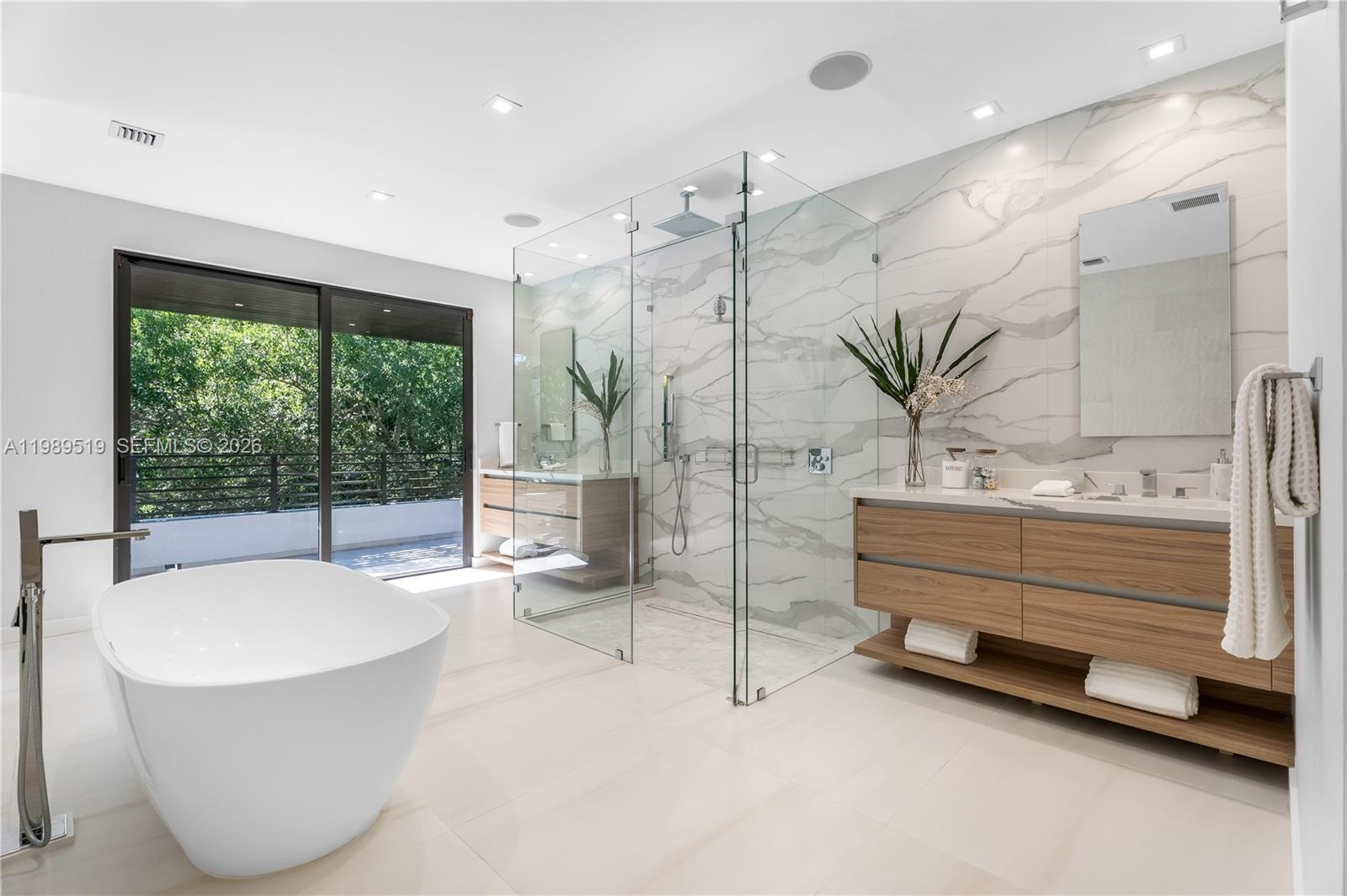 and-hers vanities, a freestanding tub, generous walk-in closets, and a private balcony. Additional features include
