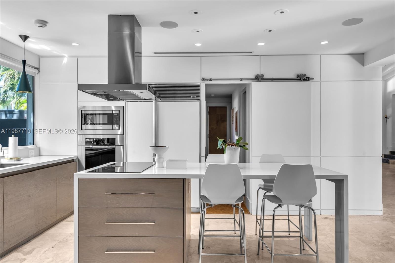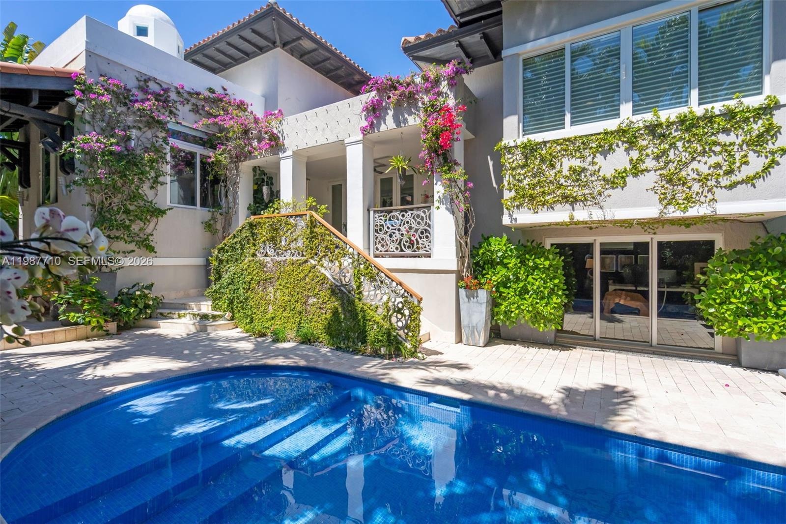 A spacious den with abundant windows and its own full bath offers flexibility as a home office, guest suite, studio, or cabana, with direct access to the patio and pool. Outdoors, enjoy a private setting with an upper veranda shaded by a living canopy of fig vines, an inviting space for dining and lounging, plus an outdoor gourmet area with a wood-fired pizza oven and tools. Additional highlights include solar panels with backup batteries for energy savings and reliability. Two batteries plus potential for expansion, two garages, and a pool with refreshed tile and grout for a crisp, updated finish. Walking distance to the beach, parks, dining, shopping, and everyday conveniences, with convenient access to Miami.