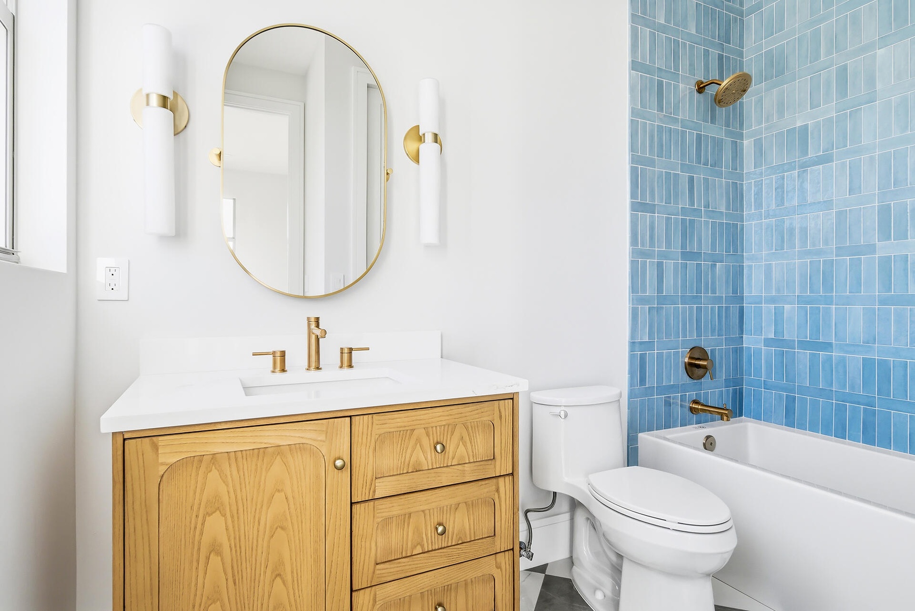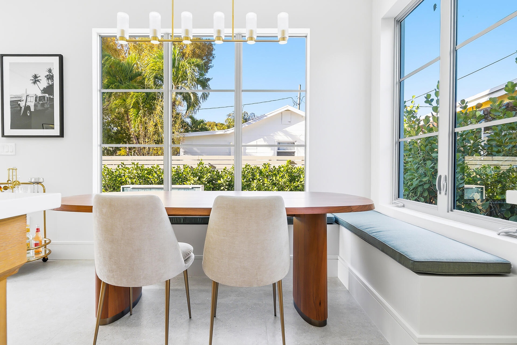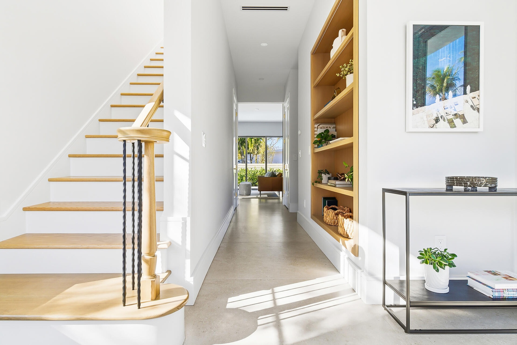 Tucked in the heart of historic Grandview Heights, this striking brand-new Art Deco residence blends architectural character with warm modern living just moments from downtown West Palm Beach in one of the city's most walkable and beloved neighborhoods. Light fills the home through dramatic curved glass windows that create a signature façade and a beautiful front sitting room perfect for morning coffee or an afternoon glass of wine. Inside, large-format porcelain floors, white oak stairs and upstairs flooring, custom cabinetry, and warm brass Kohler fixtures create a refined yet inviting interior. The kitchen features paneled high-end appliances centered around a 36" white Café gas range. Outside a resort-style pool with a tiled LED waterfall & large stone pavers creates a private retreat.