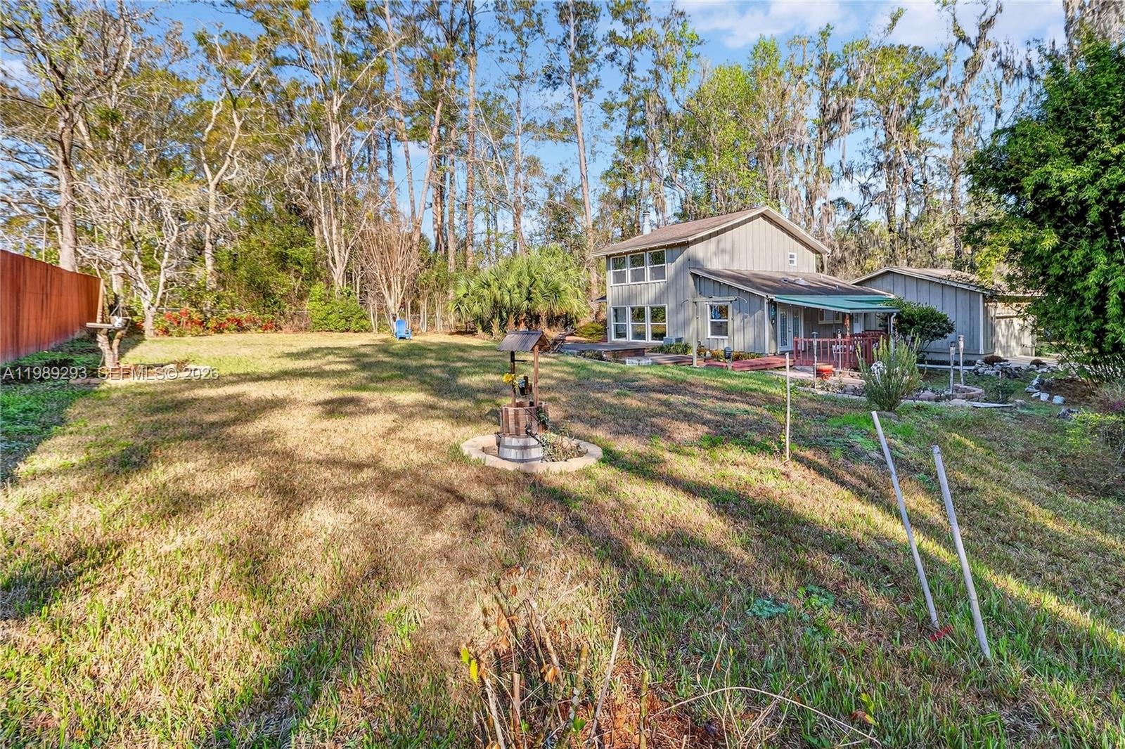 Tucked away on a private 3/4-acre lot in desirable Buckingham East neighborhood, this 1970's mid-century inspired ranch home offers a rare blend of light filled living and serene natural surroundings. Walls of glass and an open layout create seamless indoor-outdoor flow designed for everyday comfort and effortless entertaining. Located minutes from shopping, dining and all of Gainesville's amenities—including theaters, hospitals and the University of Florida—this property offers both accessibility and tranquility. Set deep within the lot, the home is surrounded by lush trees in the front yard, ensuring privacy and remarkable curb appeal, while also serving as a sanctuary for local birdlife. The surrounding gardens create an enchanting oasis, showcasing a rich tapestry of flower gardens, tropical foliage, woodlands, bamboo, manicured lawns and fluttering butterflies. Abundant natural light fills the space, highlighting a kitchen with maple cabinetry, granite countertops and S/S appliances. The kitchen seamlessly connects to the dining and living areas, which boast nearly full-height windows that frame views of the decks, gardens, and surrounding landscape. The master suite located on the main floor for added convenience opens to a private patio. The upstairs bedrooms offer beautiful views and share a full bathroom. Well-lit outdoor living spaces for entertaining while also providing a tranquil setting for evening meditation. The 720 sf Workshop is a unique and rare feature.