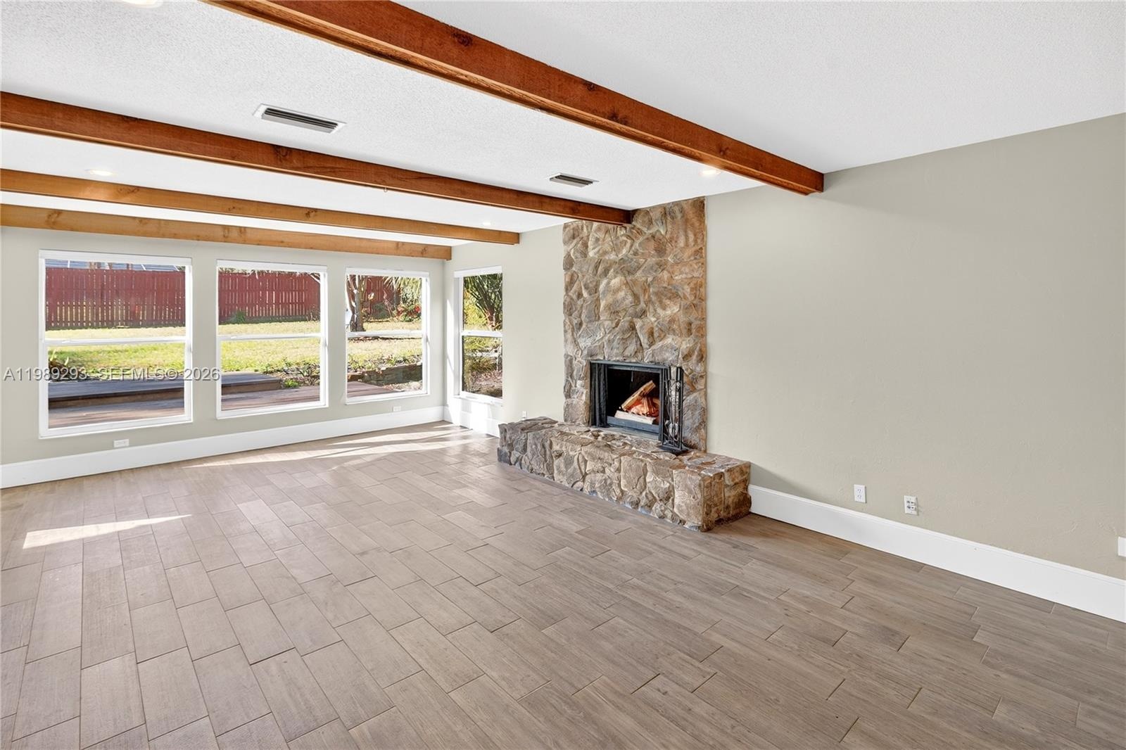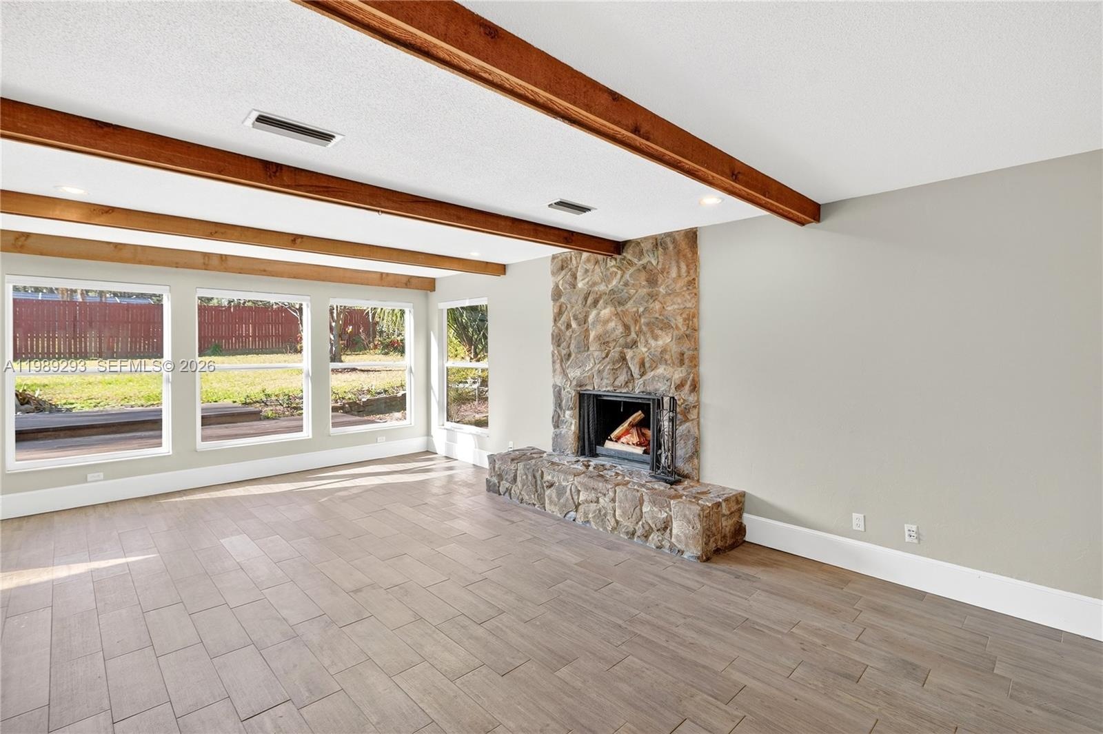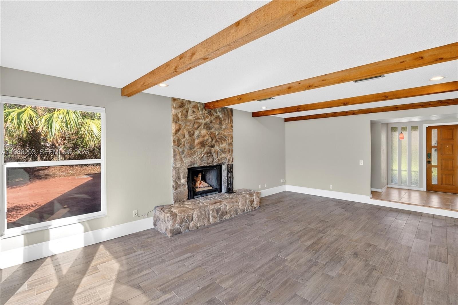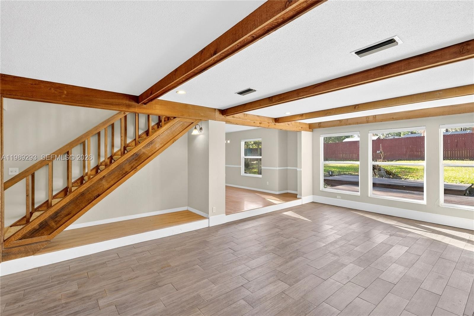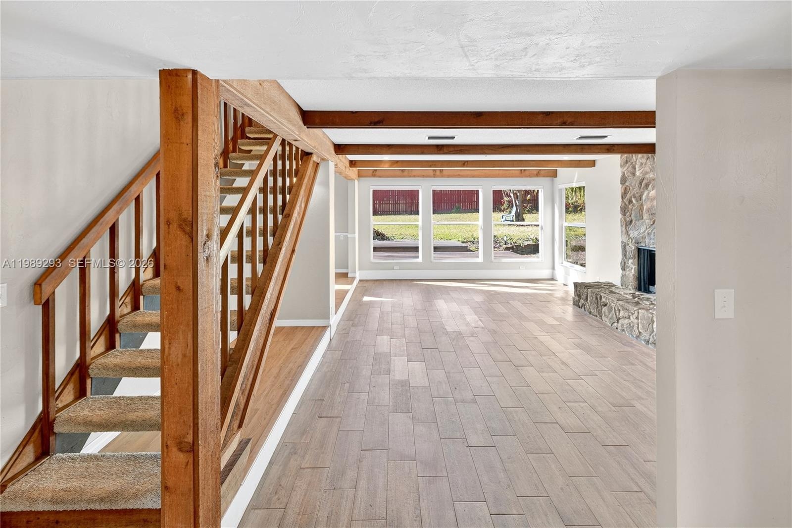 - Foyer entrance into Living Room with Fireplace and wood staircase to upstairs bedrooms and bath.