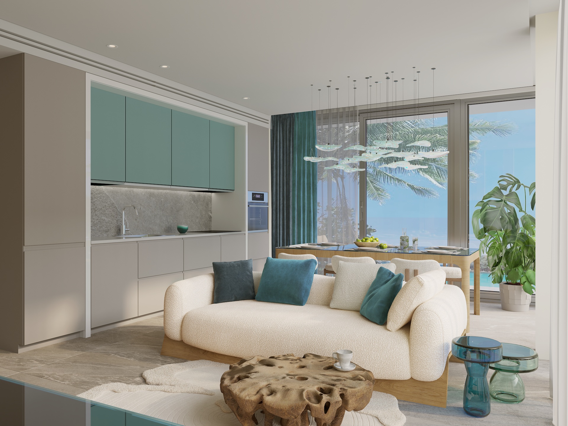 Luxury is fully celebrated in the high quality of finishes; with an average ceiling height of three meters, double vacuum-insulated glazing for protection from moisture and UV and soundproofing. The living area is open plan and features Italian Cesare kitchens with Kupperbusch built-in appliances. Air conditioning is included. There are external terraces for the flow of inside and outside living and to savour the views.There are natural teak wood furniture and floors, with additional porcelain stoneware tiles. Parking is underground with lift access. There is the potential to purchase a furniture package, to accompany that which is built in.