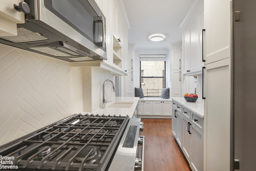Located on one of the most beautiful and tranquil tree line blocks on the Upper West Side, this serene 2 bedroom, 1 bath home is in mint condition. The entrance to this high first floor apartment is up a few steps from the lobby. A foyer leads to a gracious living room with bright western exposure and ample room for dining. The renovated windowed kitchen features a cozy window seat, and stainless steel appliances including a 5 burner gas range and Subzero refrigerator. Two large bedrooms with sunny southern exposures share a tastefully renovated hall bath. The apartment features prewar details, high ceilings, beautiful parquet floors and generous storage space throughout.