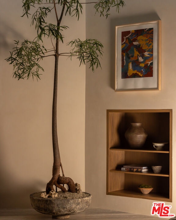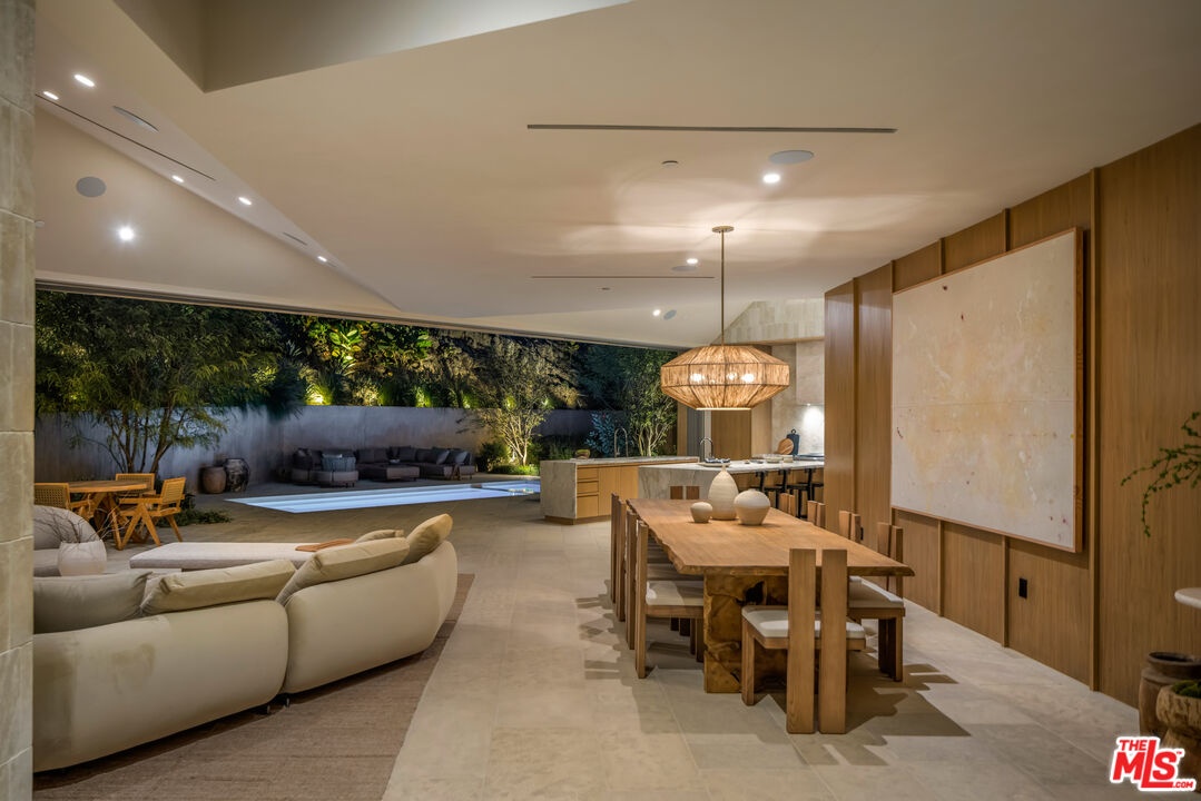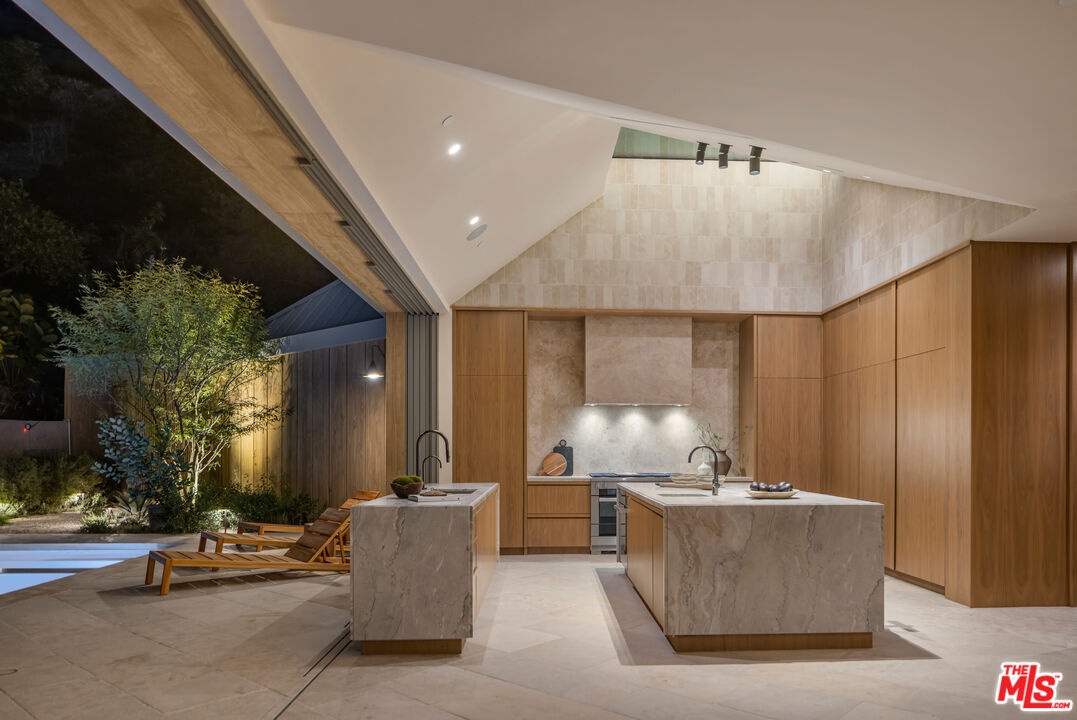 Sculpted Serenity: A timeless design ethos inspired by Amangiri where nature, light, and material exist in perfect harmony. An architectural statement above the Sunset Strip, spanning a single level across 4,600 square feet, where every surface feels sculpted rather than built. Effortless California living through world-class materials. Walls of Moroccan hand-tumbled limestone set a warm, organic tone, complemented by Egyptian limestone floors that flow seamlessly throughout. Custom walnut millwork adds depth and texture, grounding the minimalist aesthetic with natural warmth. The great room unfolds beneath high ceilings that capture shifting light, centered around a Titanium travertine lounge bar a sculptural focal point of the home. Designed for those who value art and beauty, interiors feature expansive art walls with subtle, specialized lighting. The silver-travertine fireplace and powder room bring quiet sophistication, their textures echoing the surrounding landscape. In the kitchen, a travertine hood and bespoke walnut cabinetry reflect refined simplicity and craft. The primary suite is conceived as a world-class spa retreat, with a Gold Dune stone bath, steam shower, and wellness and massage room designed for deep restoration. Each bedroom offers tranquil proportion and a seamless connection to nature. Clad in Accoya wood siding that blends with the hillside, the home feels organically rooted in its environment. A perfectly scaled pool sits in total privacy, framed by mature trees and granite outcroppings a serene retreat where architecture and landscape exist in perfect balance. 4,600 square feet includes garage