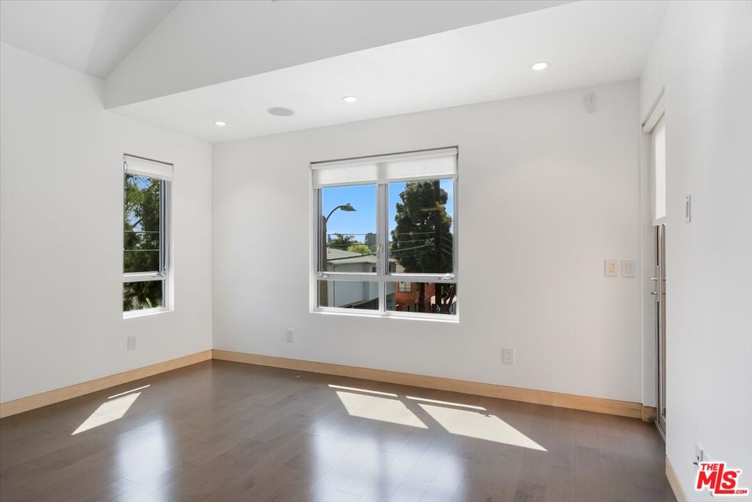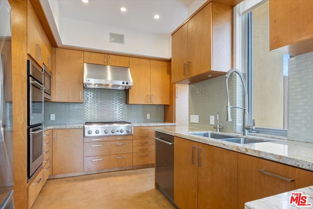 Exceptional 3-bedroom, 2.5-bath contemporary townhouse in the heart of Santa Monica offering a rare combination of architectural sophistication and resort-style amenities across approximately 1,550 sq ft of thoughtfully designed living space. The expansive open-plan living and dining area features polished concrete floors, tray ceilings, recessed lighting, in-ceiling speakers, and a wall-mounted fireplace. Floor-to-ceiling windows and sliding glass doors flood the space with natural light and open to multiple private outdoor areas including a landscaped ground-level patio and an upper balcony with frameless glass railings. The chef's kitchen is appointed with custom wood cabinetry, stone countertops, glass tile backsplash, professional 6-burner gas range, double wall ovens, built-in microwave, and stainless steel appliances. Generously sized bedrooms feature soaring vaulted ceilings and dark hardwood floors. The primary suite includes a custom walk-in closet with built-in cabinetry, a spa-inspired bath with dual vanities and glass-enclosed rain shower, and a private terrace that leads to an exclusive rooftop retreat the perfect spot to unwind and soak up the California sun. A powder room services the main living level. A private in-unit elevator with wood-paneled cab provides seamless access to all levels a rare and coveted feature that sets this home apart. Additional highlights include an in-unit washer/dryer and two assigned spaces in the secured underground garage. Gated entry. Minutes to the beach and Main Street.
