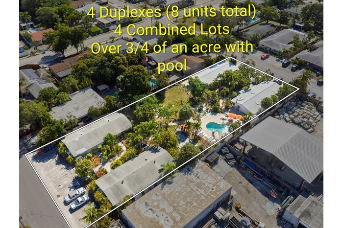 Calling All Investors! A rare and amazing opportunity to own an assemblage of 4 combined lots with 4 duplexes!8 units total, all units feature a consistent 2-bedroom, 1-bathroom layout. Situated on over 34,000 sq. ft. of combined land, these properties offers significant outdoor space and future development potential. This assemblage includes a shared community pool and ample off-street parking with 24 total spots (3:1 ratio). Ideally positioned for commuters and lifestyle renters, with close proximity to Wilton Manors and Downtown Fort Lauderdale. Exceptional "fix-and-flip" or "buy-and-hold" opportunity with a projected post-renovation rental income of $20,000 per month.