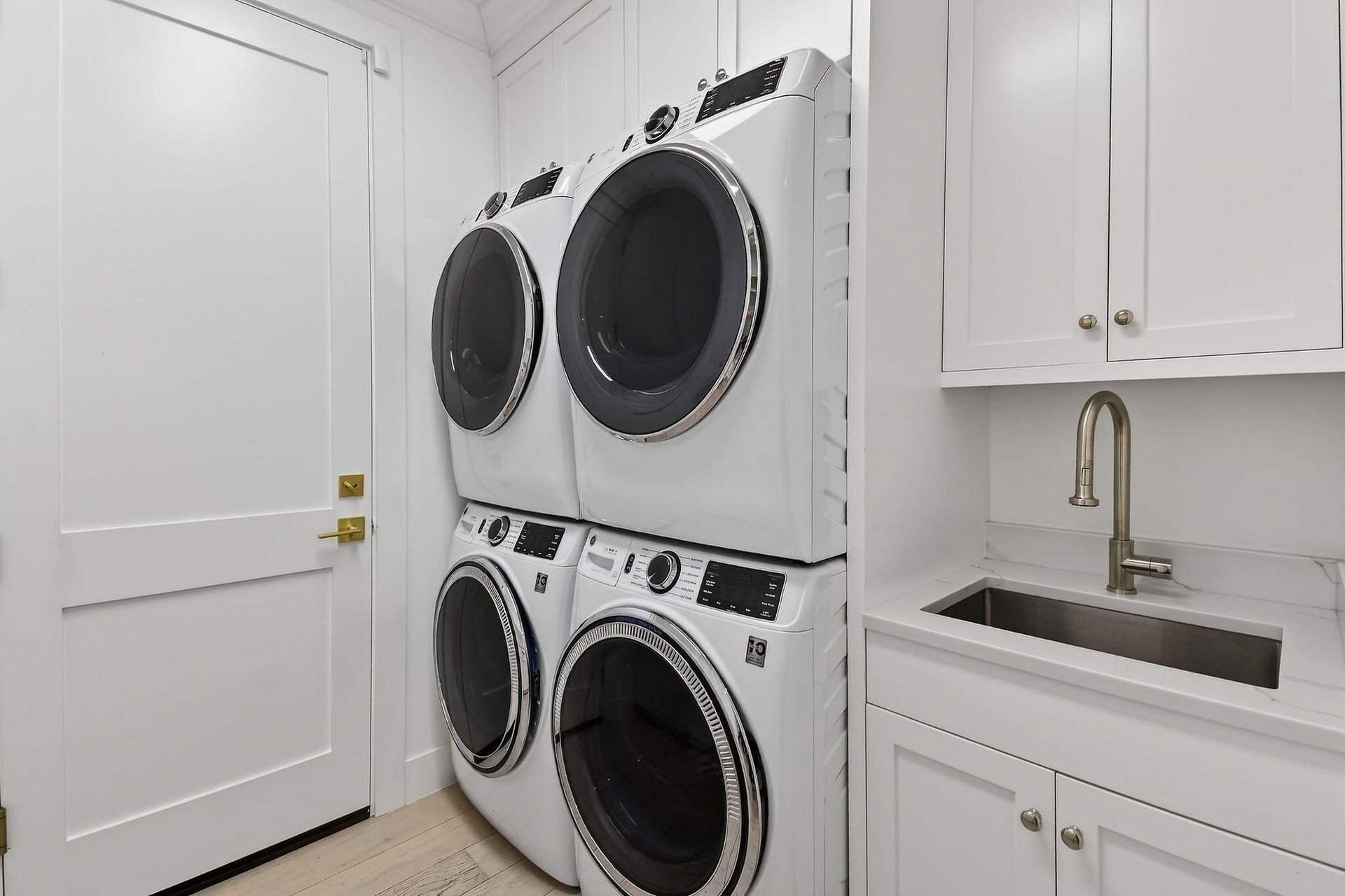 Experience refined South Florida living in this beautifully maintained 5-bedroom + den Windsor Park home in Abacoa. Built in 2016 by DiVosta, this two-story CBS residence offers full impact glass and solid concrete second-floor construction, combining quality with peace of mind. Set on a prime corner lot, the home features a spacious wraparound porch and an open, light-filled layout. The main level includes formal living and dining areas highlighted by a custom 150-bottle temperature-controlled wine wall, a private office with glass French doors, and a well-appointed laundry room with custom cabinetry. The bright kitchen and family room open seamlessly to the backyard through expansive sliders, creating ideal indoor-outdoor living. Outside, a professionally designed retreat awaits with a heated pool and spa, travertine decking, sun shelf, putting green, and lush tropical landscaping. Upstairs, four bedrooms feature wood flooring throughout, including a generous primary suite with private balcony access and custom closets. Additional upgrades include a 3-car tandem garage with EV charging, motorized shades, plantation shutters, smart home features, and detailed millwork throughout. Windsor Park offers a resort-style clubhouse, pool, fitness center, and playground, all just minutes from top-rated Jupiter schools, beaches, golf, and dining.